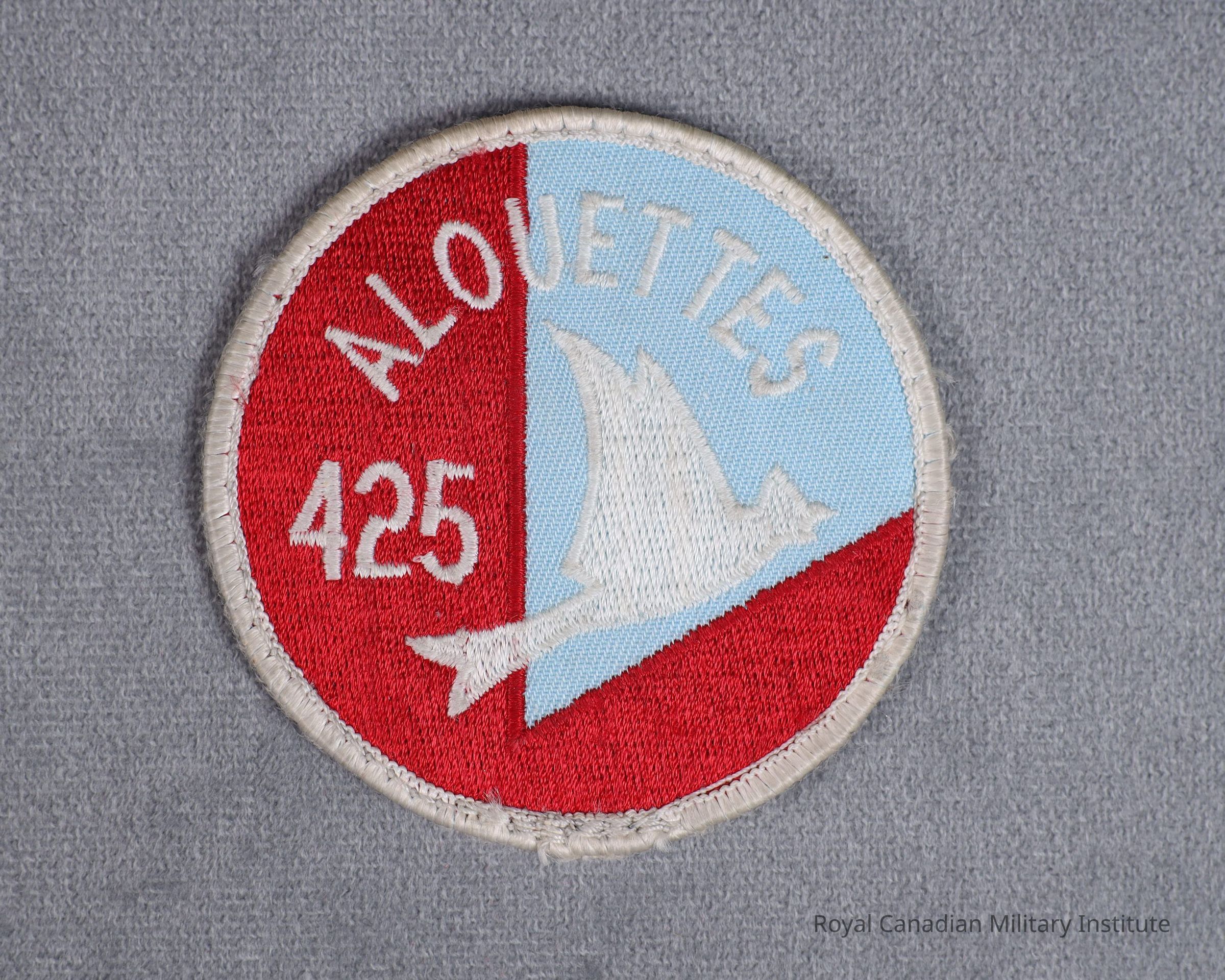 1990's Canadian Forces (425 Tactical Fighter Squadron) shoulder patch. Circular, cotton and polyester weave. Red and blue background with white thread edge, white thread machine-stitched title "Alouettes 425" and white bird. Rear has white velcro backing.Made/Created