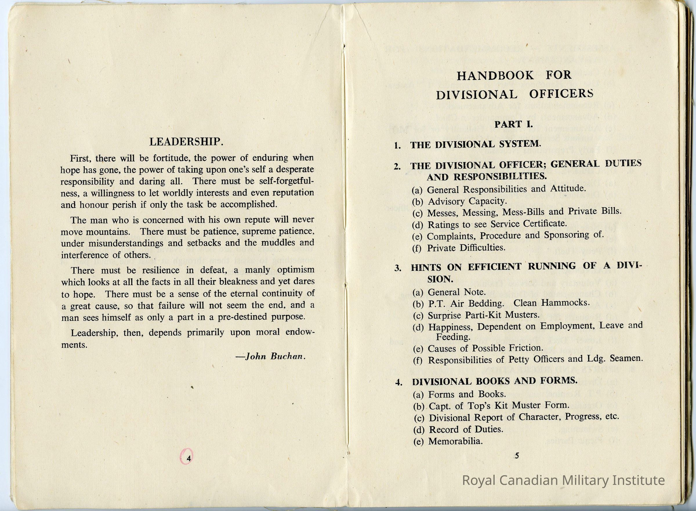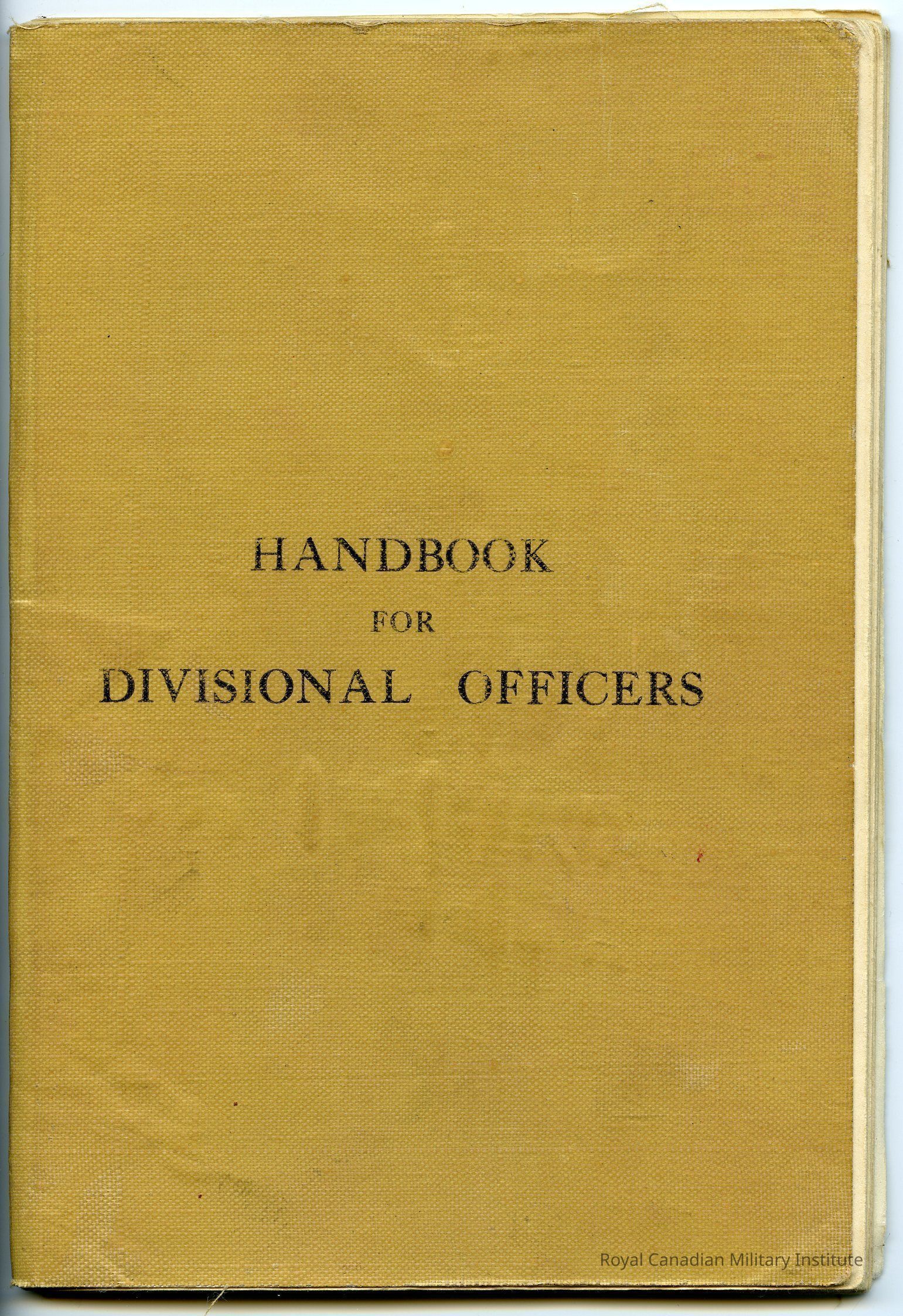 1940-1944 Royal Navy Handbook For Divisional Officers. Rectangular, tan card/canvas cover. Contains chapters on: Divisional system, Officers' Duties and Responsibilities, Efficient Running of a Division, Divisional Books and Forms, Promotions/Discipline/Punishment, Training, Sports and Recreation, Health and Sanitation, Ratings New and Leaving, Kit and Kit Regulations, Subversive Elements, Welfare. 7 appendices.Made/Created