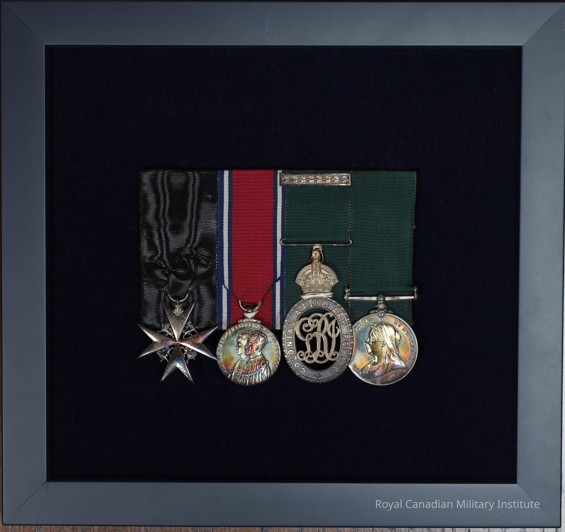 1900's Most Venerable Order of the Hospital of St. John of Jerusalem (Serving Brother), to Lieutenant-Colonel J.B. MacLean, Duke of York's Royal Canadian Hussars. Flat silver eight-pointed Maltese Cross with white-enamelled arms, in between are two white metal lions and two white metal unicorns. Loose ring suspender on watered black ribbon, 3.7 x 7.7 cm.