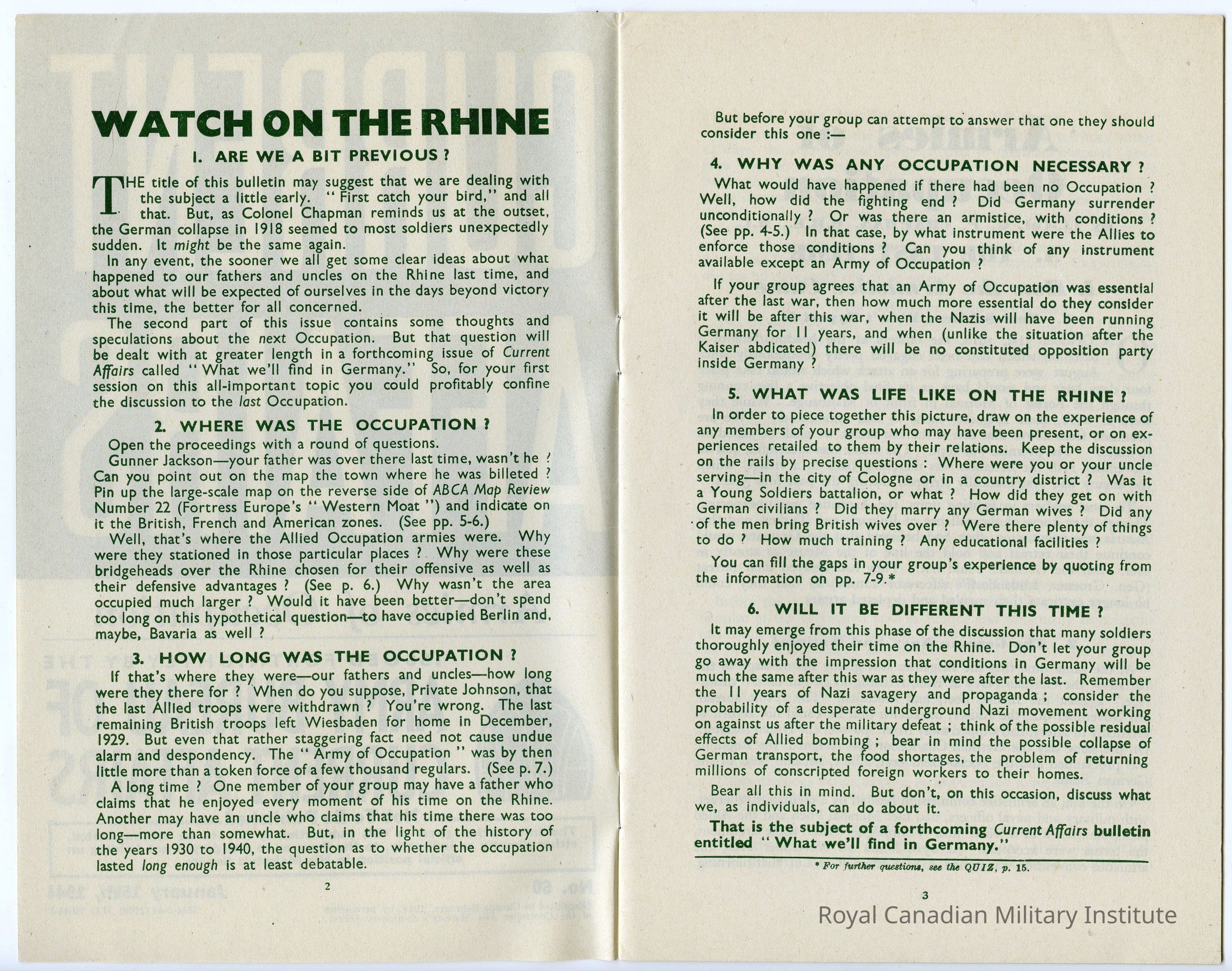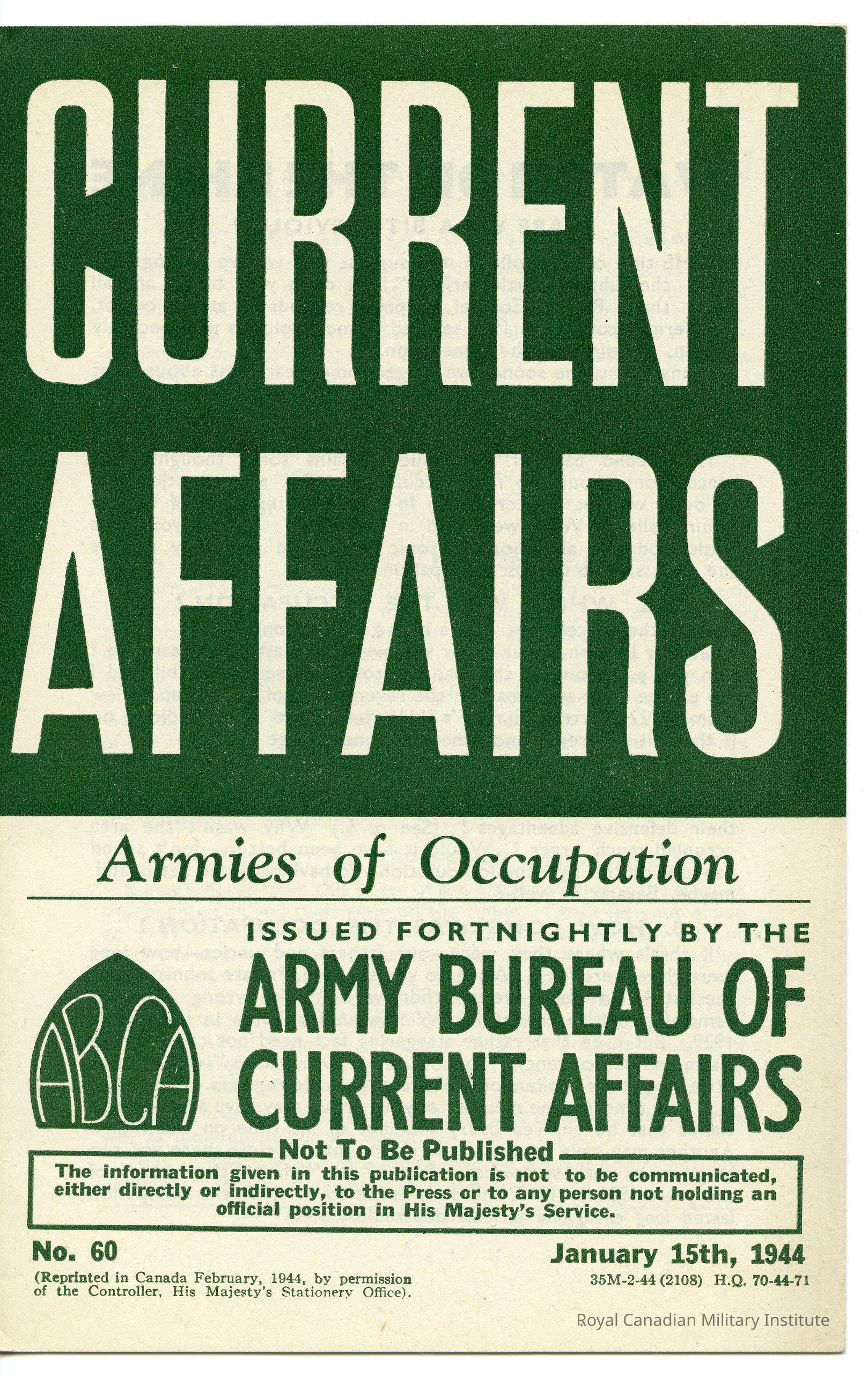 British Army Bureau of Current Affairs pamphlet No.60 (15 January 1944). This newsletter, issued bi-weekly, was intended as an internal publication. This issue handles the topic of "Armies of Occupation". The cover is dark green and beige and the whole pamphlet is 16 pages. It was originally printed in Britain and reprinted in Canada in February 1944. The main part of the pamphlet was written by Lt.Col. G.P. Chapman.
