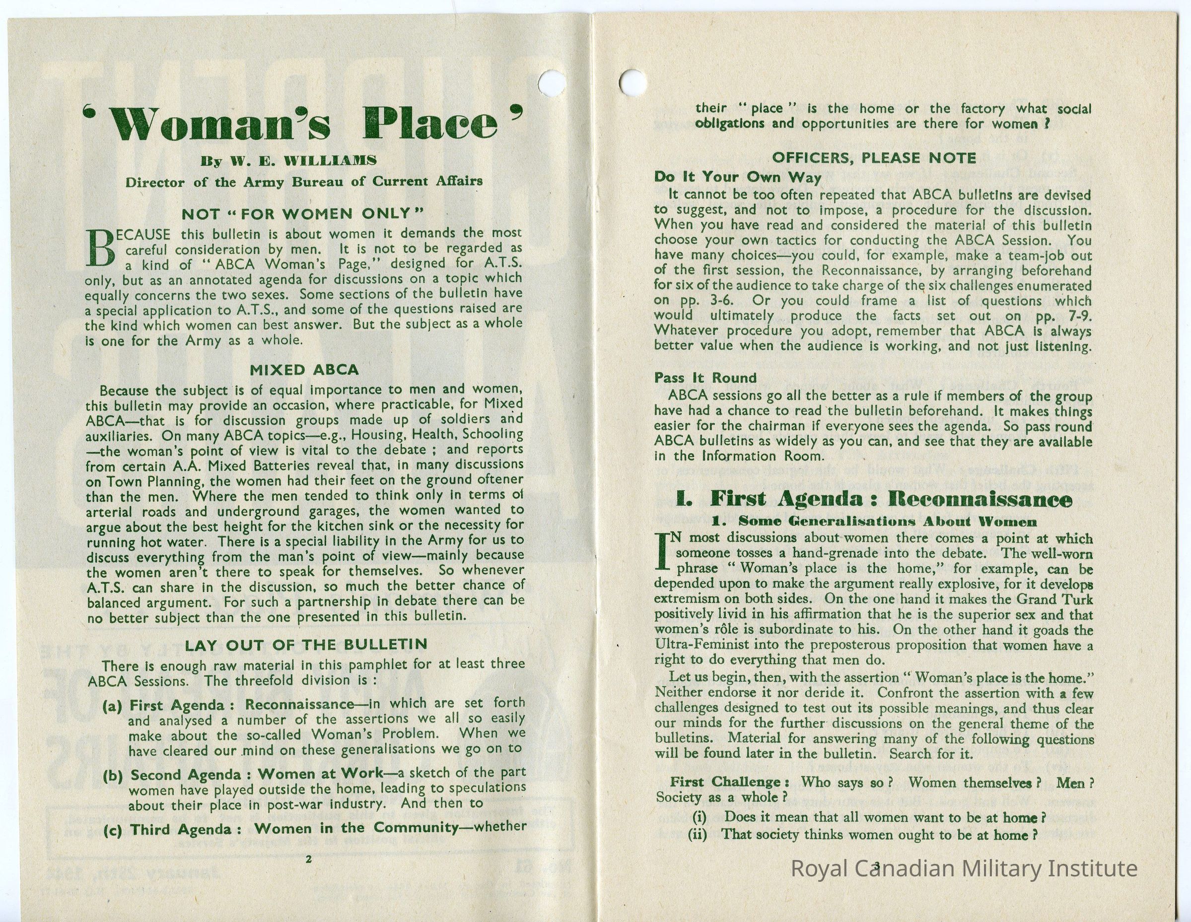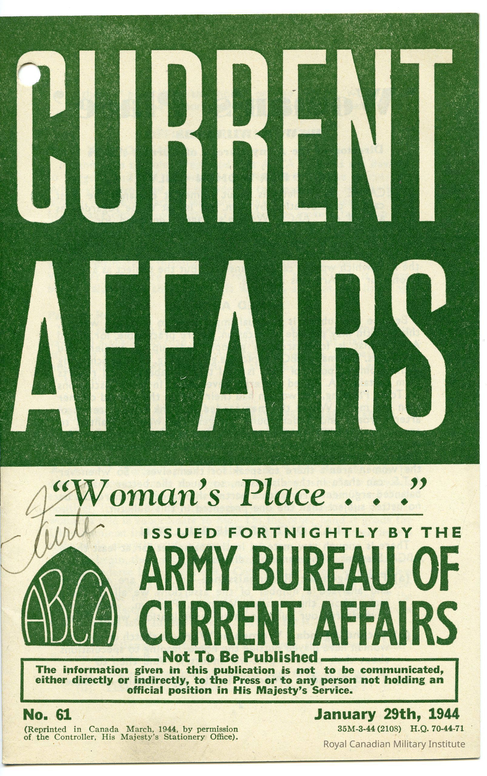 British Army Bureau of Current Affairs pamphlet No.61 (29 January 1944). This newsletter, issued bi-weekly, was intended as an internal publication. This issue handles the topic of "a woman's place." The cover is dark green and beige and the whole pamphlet is 16 pages. It was originally printed in Britain in January 1944 and reprinted in Canada in March. Written in pencil on the front cover is "Fairle" (?)Made/Created