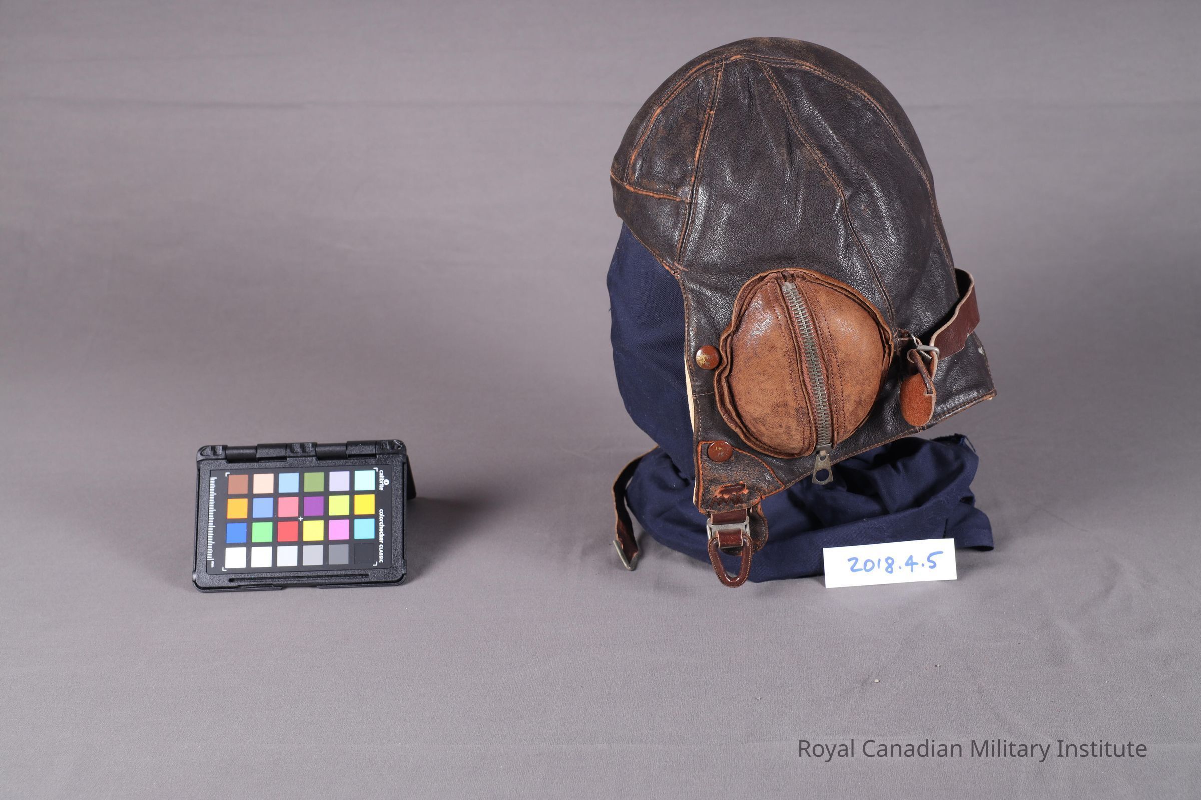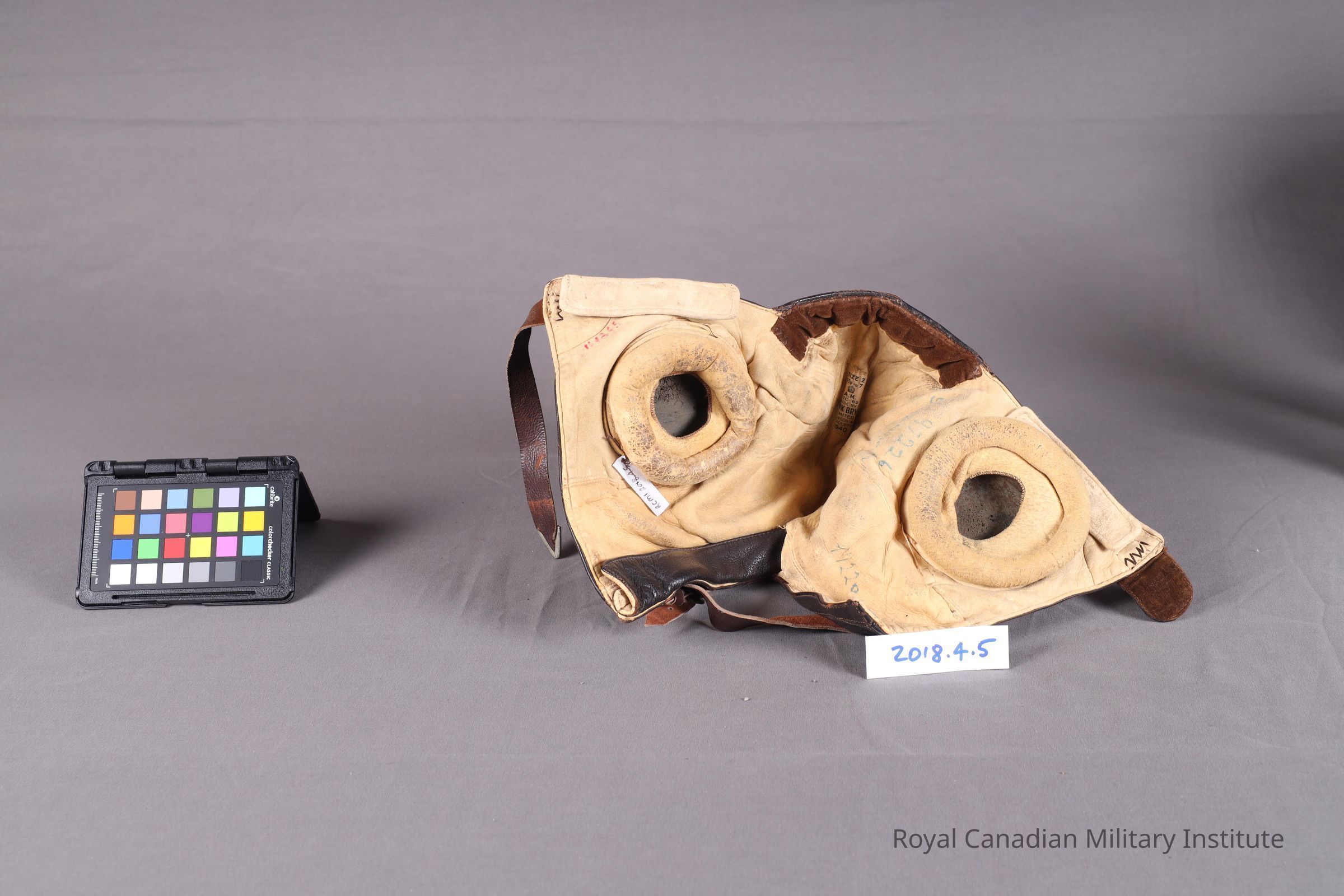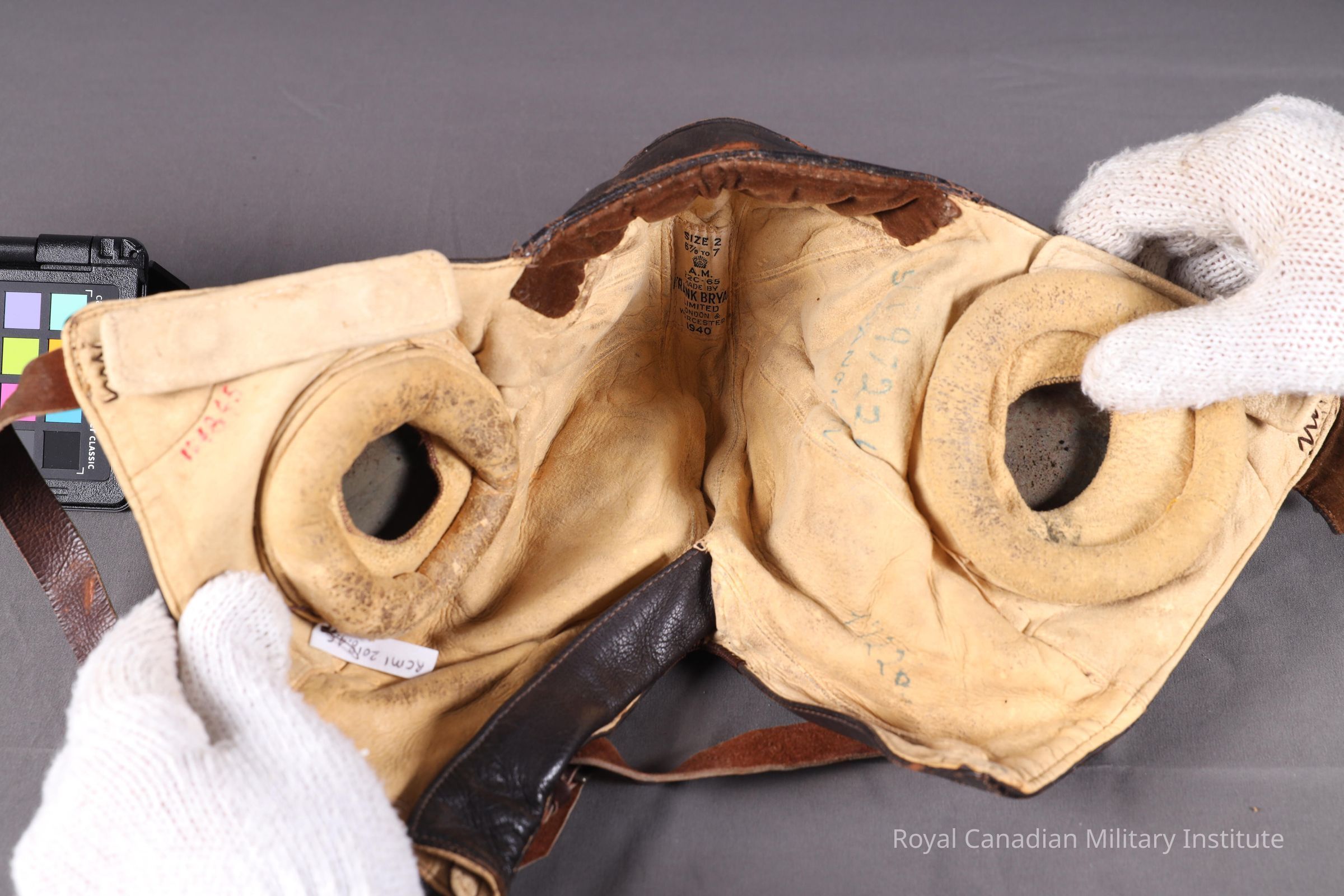 1936-1941 RAF Type "B" flying helmet. Classic dark brown chrome leather, 13 piece machine-stitched crown/body, vertical panels, plus two distinctive lighter brown zippered earcups for communications receivers. Slit back 13 cm. long with brown leather adjustment strap 3 x 26.5 cm. Right side brown leather chinstrap 2 x 29 cm. Left side brown leather/steel "Bennett" type locking buckle. Interior is light tan chamois with extra padding for earcups. Along lower sides are snap-fastened chamois liner strips above snaps to clip on the Type "D" oxygen mask, each 2.5 x 10.3 cm.Made/Created