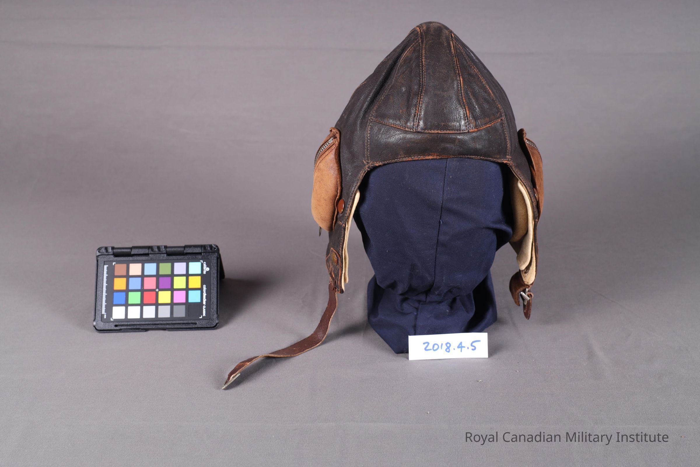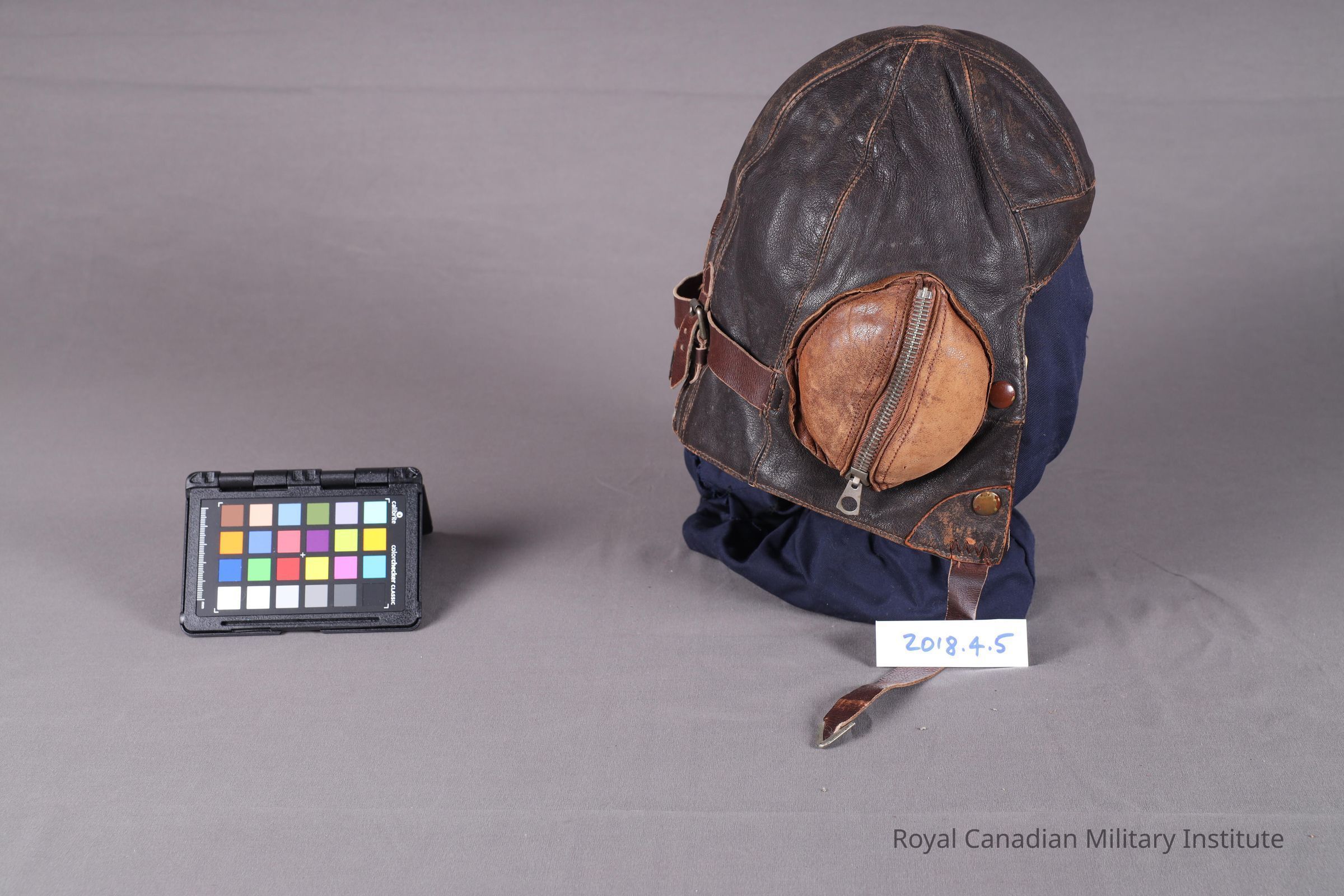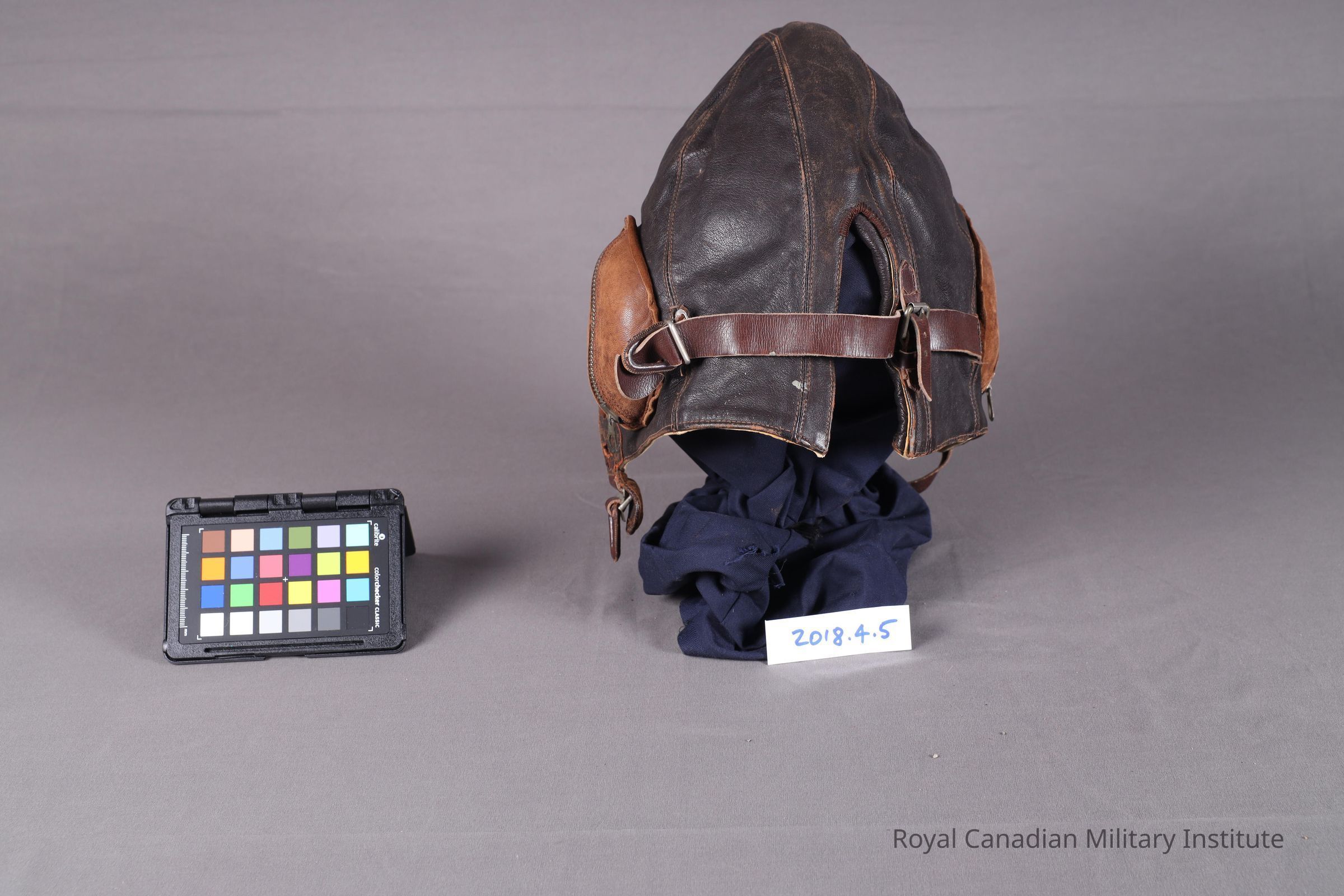 1936-1941 RAF Type "B" flying helmet. Classic dark brown chrome leather, 13 piece machine-stitched crown/body, vertical panels, plus two distinctive lighter brown zippered earcups for communications receivers. Slit back 13 cm. long with brown leather adjustment strap 3 x 26.5 cm. Right side brown leather chinstrap 2 x 29 cm. Left side brown leather/steel "Bennett" type locking buckle. Interior is light tan chamois with extra padding for earcups. Along lower sides are snap-fastened chamois liner strips above snaps to clip on the Type "D" oxygen mask, each 2.5 x 10.3 cm.Made/Created