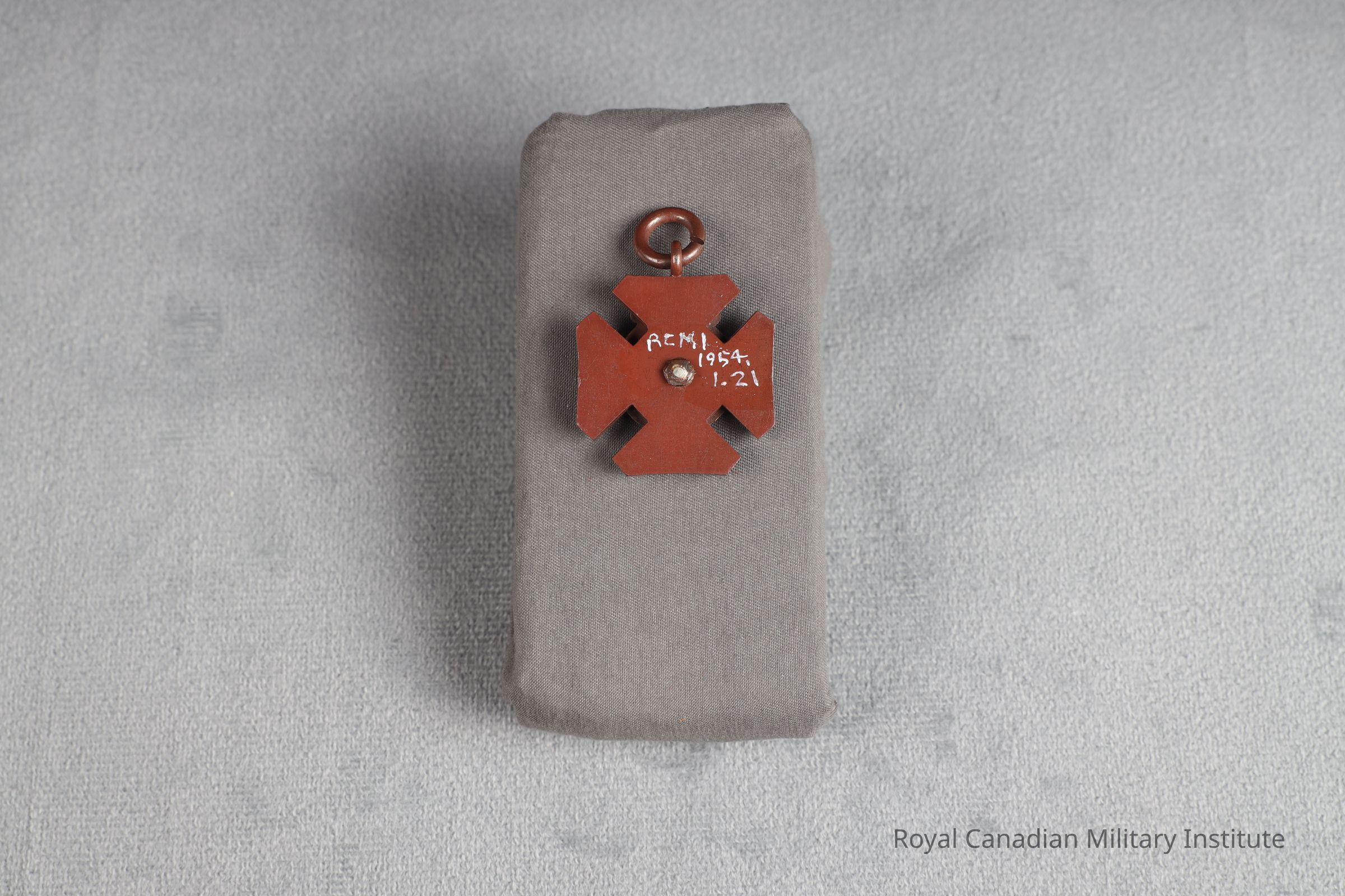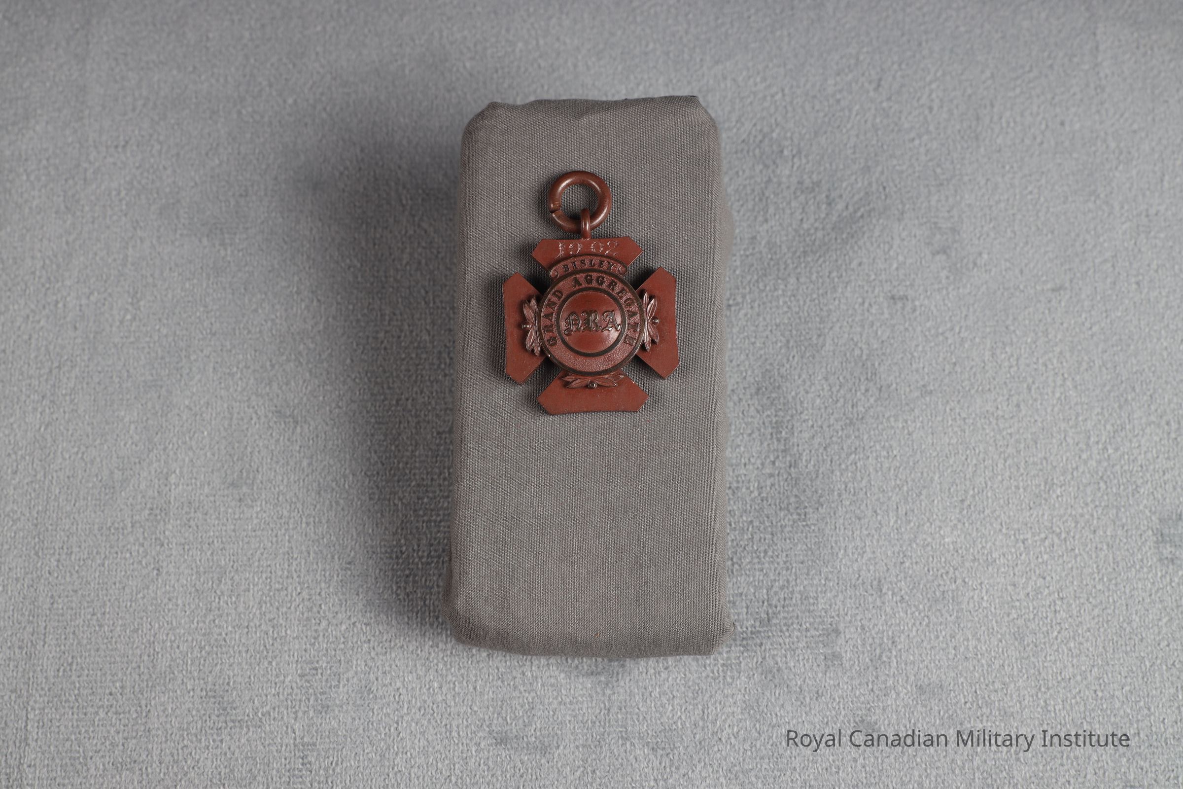 1902 American Rifle Association Grand Aggregate Bisley medal. Copper Maltese Cross. Obverse smooth arms, raised centre with two circles, inner with scrolled letters "ARA", outer with title "Grand Aggregate" At top arm is inscribed date "1902" and scroll "Bisley" foliate scrolls on bases of three of four cross arms. Reverse is flat. Suspender at top arm of fixed ring and loose ring.