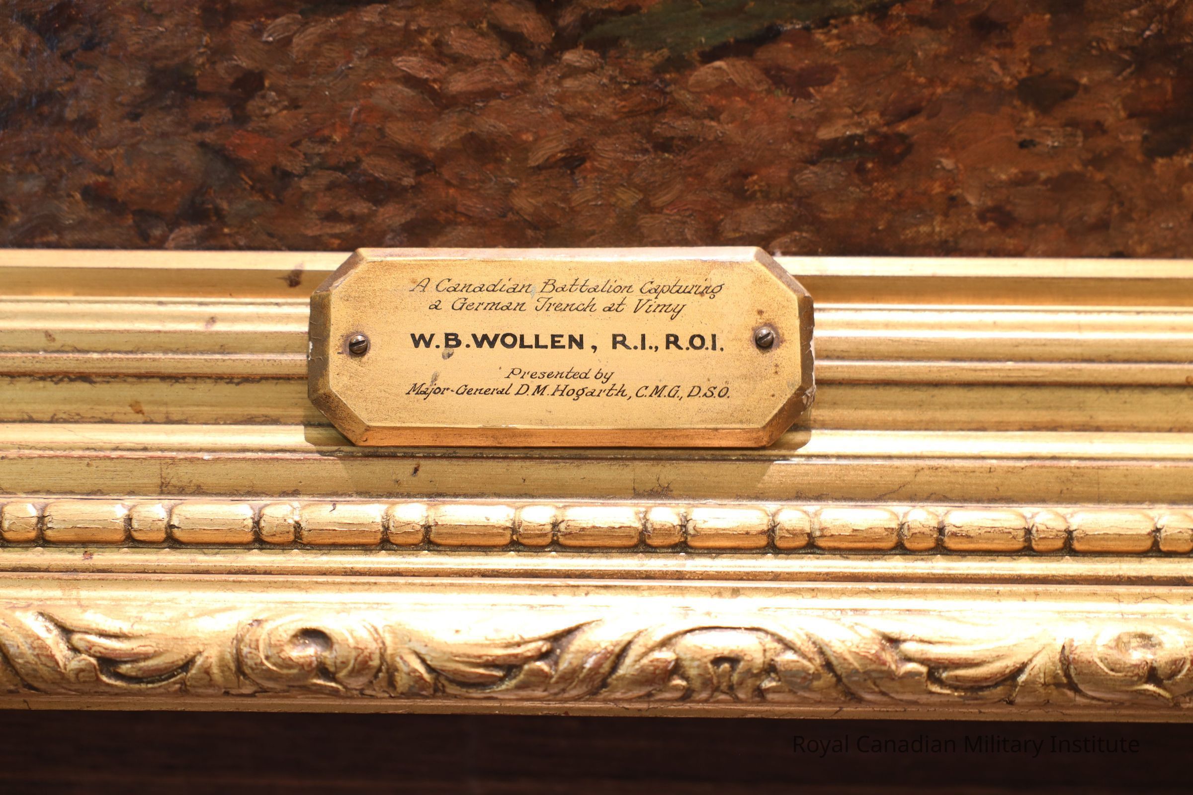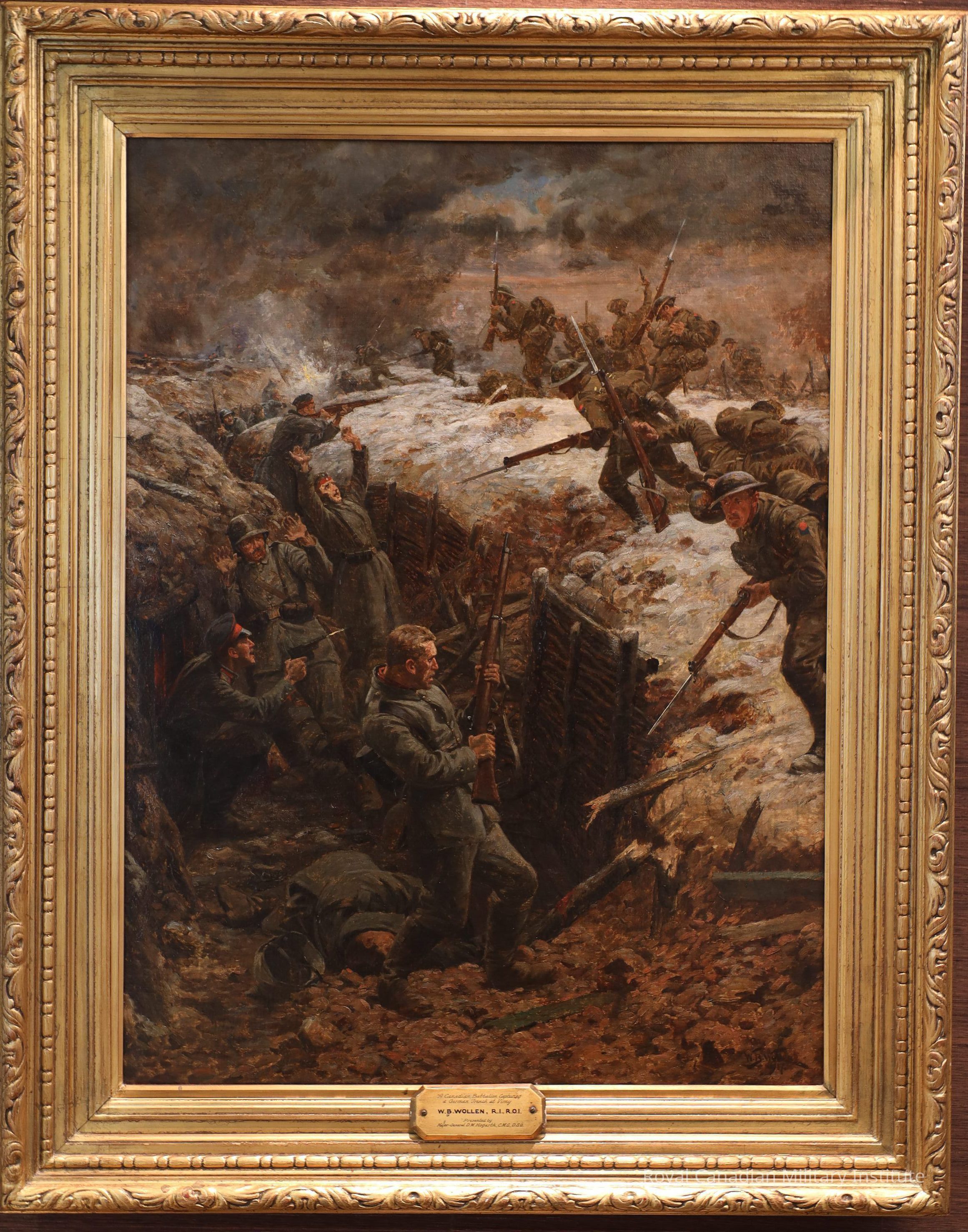 Oil painting (oil on canvas) "A Canadian Battalion Capturing A German Trench At Vimy." Detail shows at least thirteen Canadian soldiers with fixed bayonets storming a German trench line. There are nine German soldiers in the trench, one officer firing a pistol, one private firing a rifle, four soldiers cowering, one dead, two caught in shell blast.
