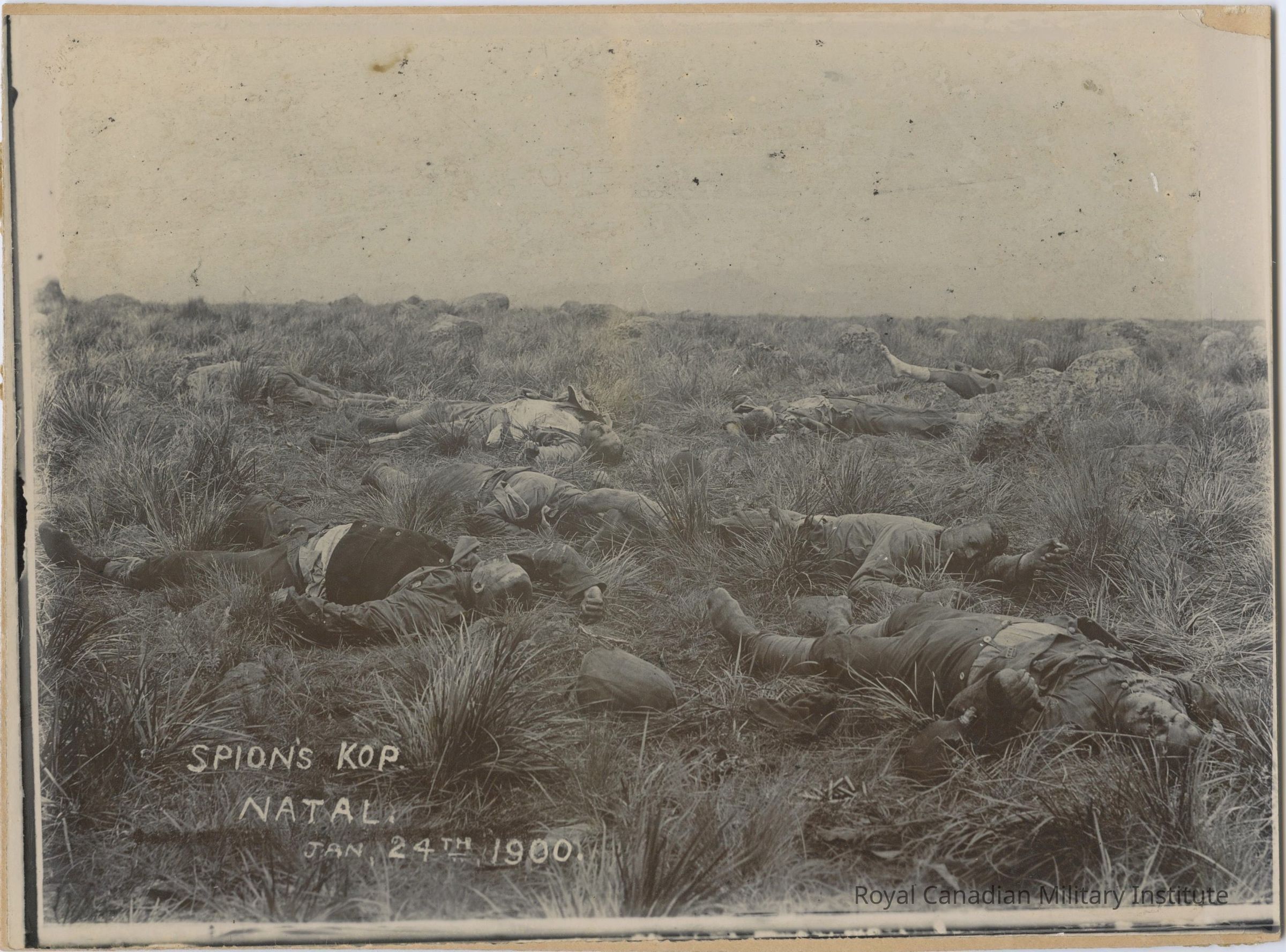 6 1/2 X 8 1/2 inch black/white photograph "British dead at Spion KOP, 26 Jan 1900." Detail shows British Infantry dead from rifle fire on the hill of Spion Kop, 23-24 Jan 1900. The British dead are dressed in standard infantry uniforms: service dress tunics, trousers, puttees, boots. Tropical issue helmets are on the ground.Context
