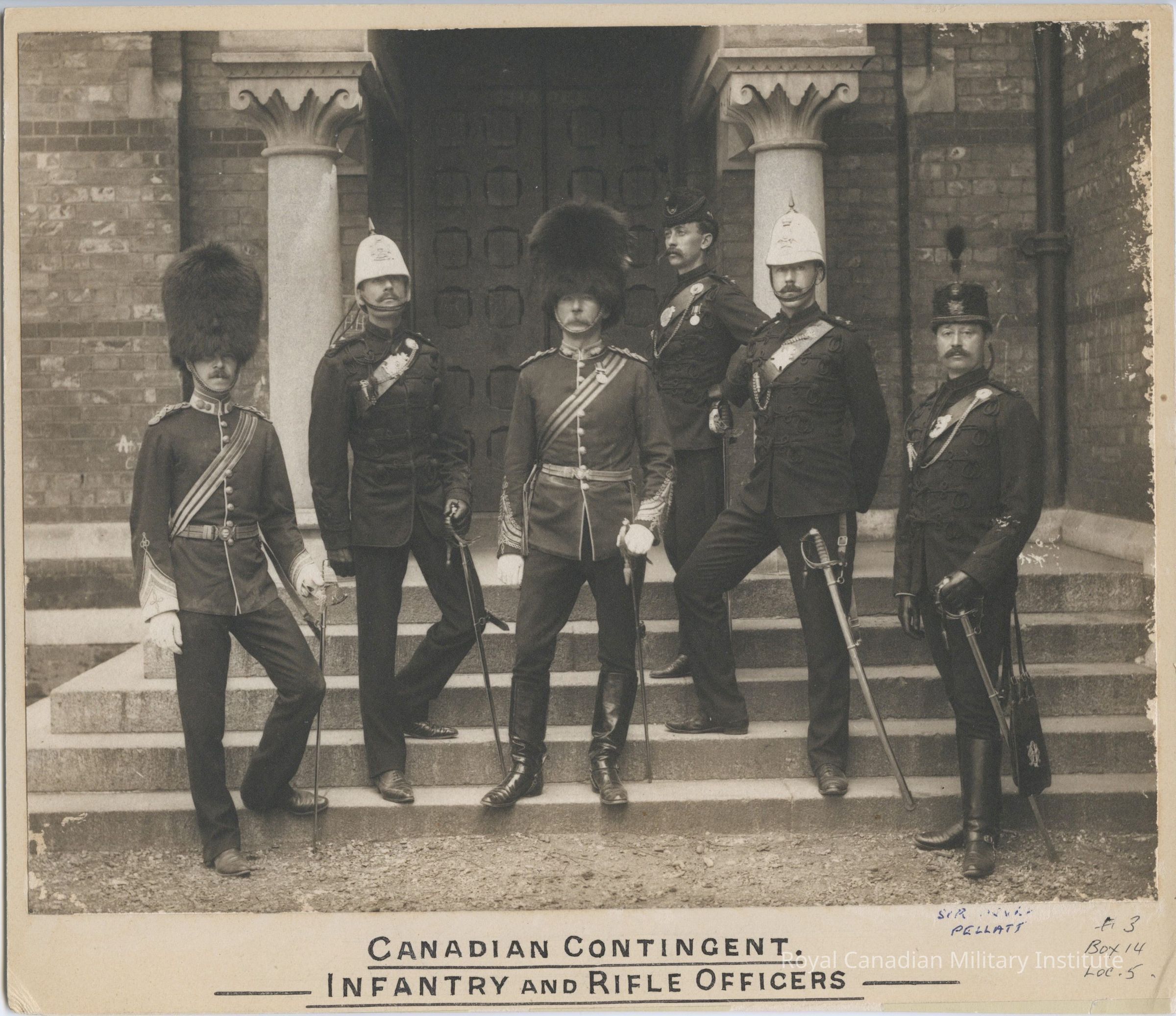 Photograph "Canadian Contingent, Infantry and Rifles officers, Quebec, June 1897." 6 1/2 X 8 1/4 inch sepia-toned black/white photograph "Canadian Contingent Infantry and Rifle Officers" Detail shows Grenadier Lieutenant, 65th Carabiniers Lieutenant, Grenadier Colonel, 22nd or 37th Rifles Lieutenant, 2nd Queen's Own Rifles Lieutenant, 38th Dufferin Rifles Lieutenant; all in Full dress uniforms with Bearskins, Wolseley whte helmets, black busbies. Queen's Own Rifles Officer is Henry Pellatt (with sabretache).