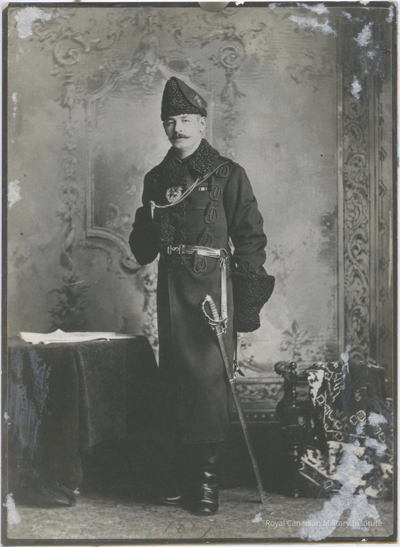 4 1/1 X 6 inch black/white photograph "Lieutenant Henry Brock, 2nd Battalion, Queen's Own Rifles of Canada 1882-1887." Detail shows full length portrait of Brock in a black lambskin fur hat, (Regimental Cap Badge), black lambskin winter great coat (collar, lace net balls), trousers, wellington boots; accoutrements of black leather gloves, black leather crossbelt (silver crossbelt plate whistle, chains), black leather waist belt (metal snake clasp) with slings holding pattern 1845 sword.Context