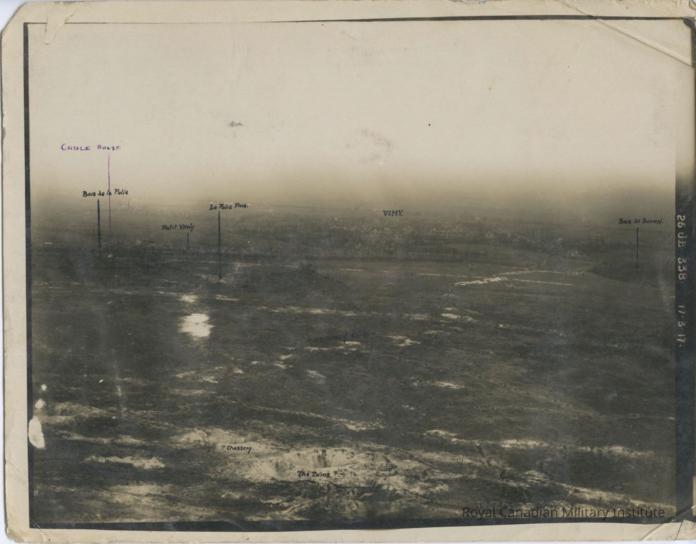 6 7/8 X 8 7/8 black/white photograph "26 J.B. 338.21.3.17 (Vimy Ridge panorama 21 Mar 1917)." Detail shows Vimy in centre background, also Petit Vimy, Bois de Bonval. In centre are Craters "The Twins."Context