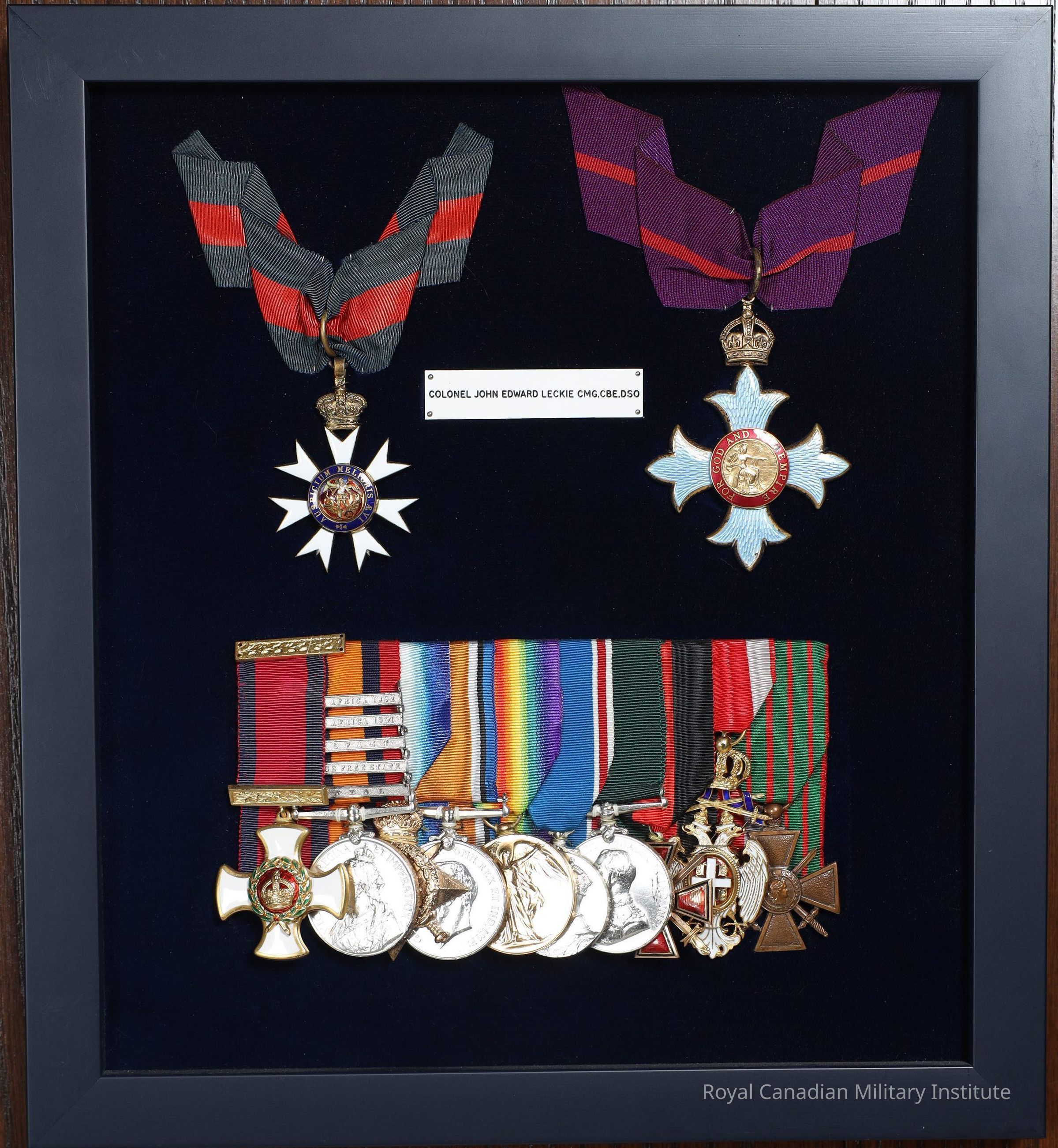 The Most Excellent Order of the British Empire, Commander Grade, to Colonel John Edward Leckie. Gold cross patnonce (four arms, each with three points) with gold king's crown at top point. Arms enamelled light blue. In centre a gold field with Britannia surrounded by red enamelled circle and gold title "For God and the Empire" Reverse has crown and Royal Cypher with rope surround. Suspender a fixed ring with loose ring to ribbon, purple, scarlet, purple, 3.7 x 20 cm. Depicted in the top row on the right.