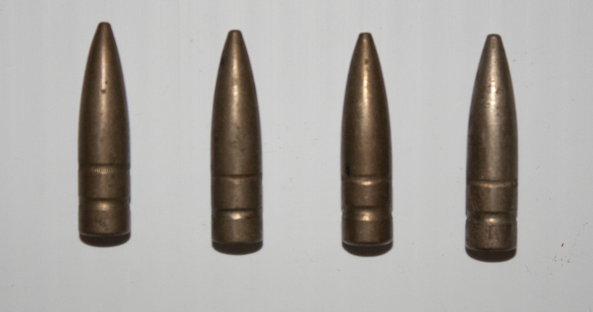 The redesigned bullet weighed 174 grains and as introduced had a cannelure near the base into which the case neck was slit crimped. When neck coning replaced the slit crimps for bullet securement in 1944, the cannelure was moved to a new higher position. The bullet was flat based with an 8CRH ogive and a composite core, the forward part usually being aluminum and the rear part a 98/2% lead/antimony alloy. During wartime, the aluminum tip was replaced by compressed paper, fibre or ceramic.