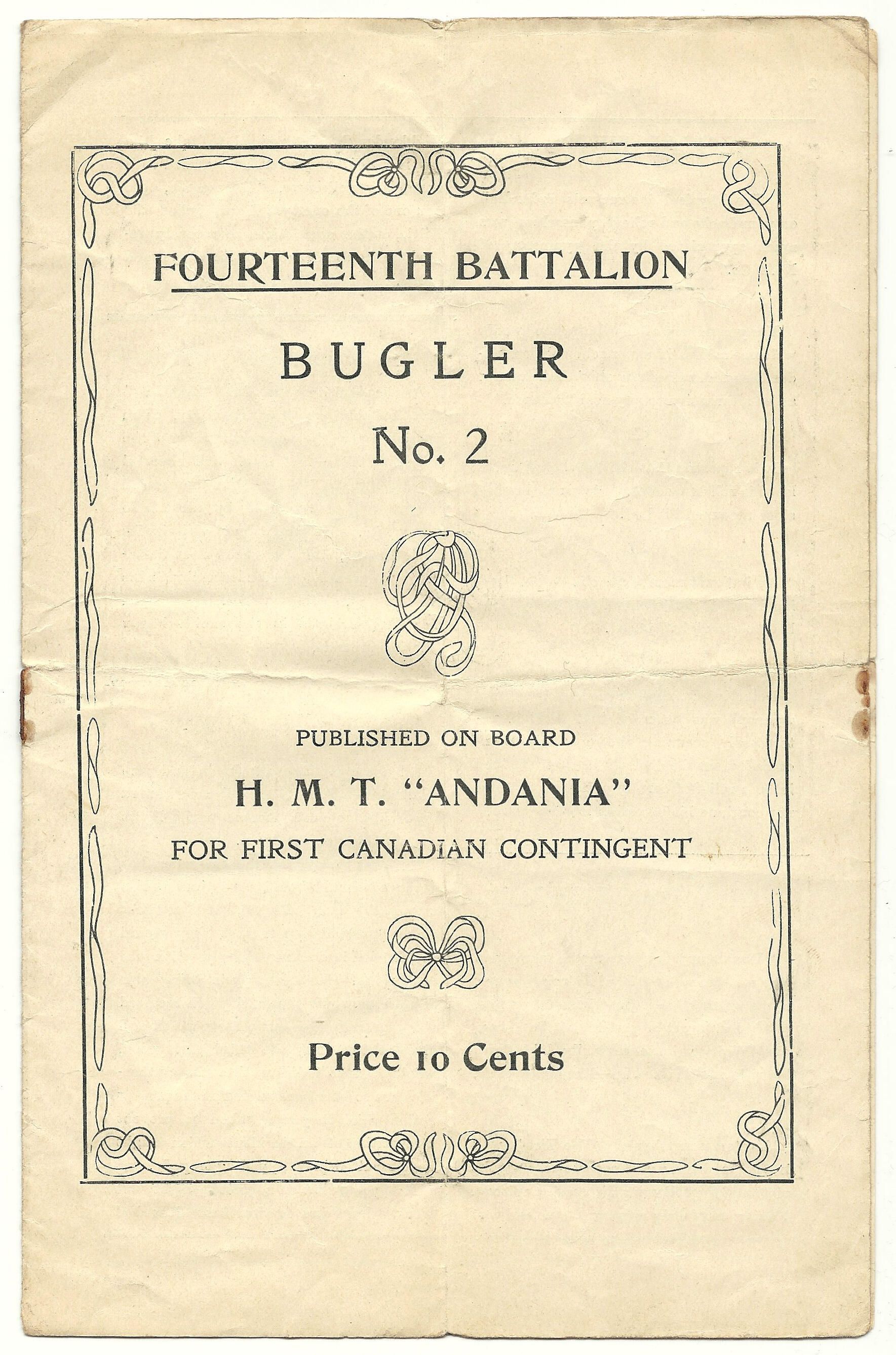 Started in 1914, the Bugler was an internal newsletter published by the 14th battalion. This issue was published, at sea, on the H.M.T Andania on its way to England. Censorship stopped the publication but it came back under The Growler in 1916.Lexicon