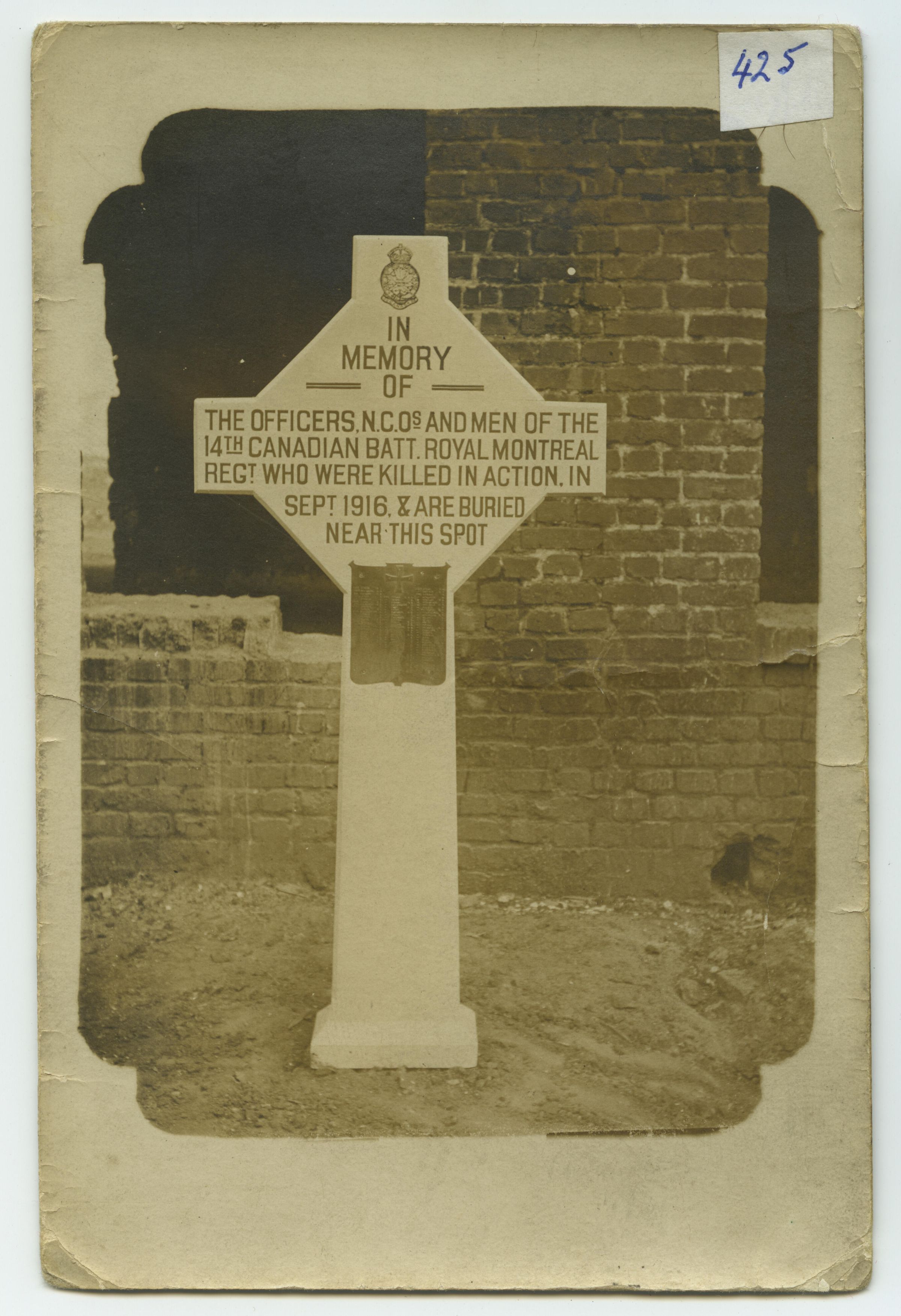 Memorial Cross "In Memory of the Officers and N.C.O.s and Men of the 14th Canadian Batt. Royal Montreal Regt. who were killed in action in Sept. 1916 & are buried near this spot". There is a plaque on the cross beneath that inscription with the names of the fallen on it. The cross was standing in front of a partially demolished brick wall.Made/Created