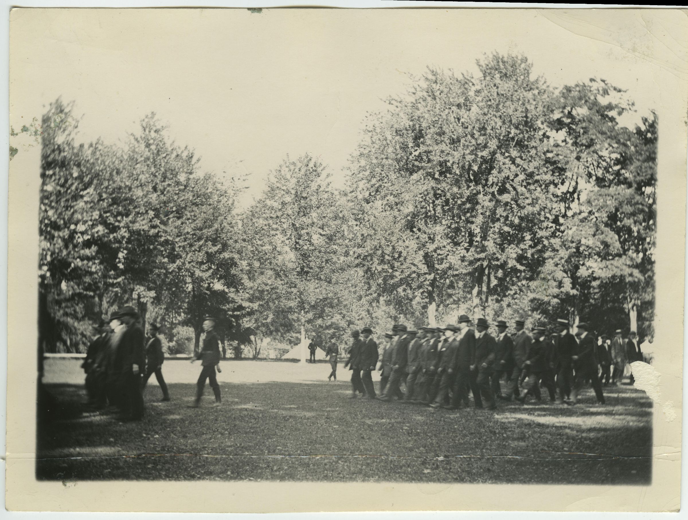 Recruits of the Victoria Rifles Company of 14th Bn., the Royal Montreal Regiment, drilling on the lower campus of McGill University. Two groups of men dressed in civilian clothes are marching. In the background are trees in full foliage.Photograph Details