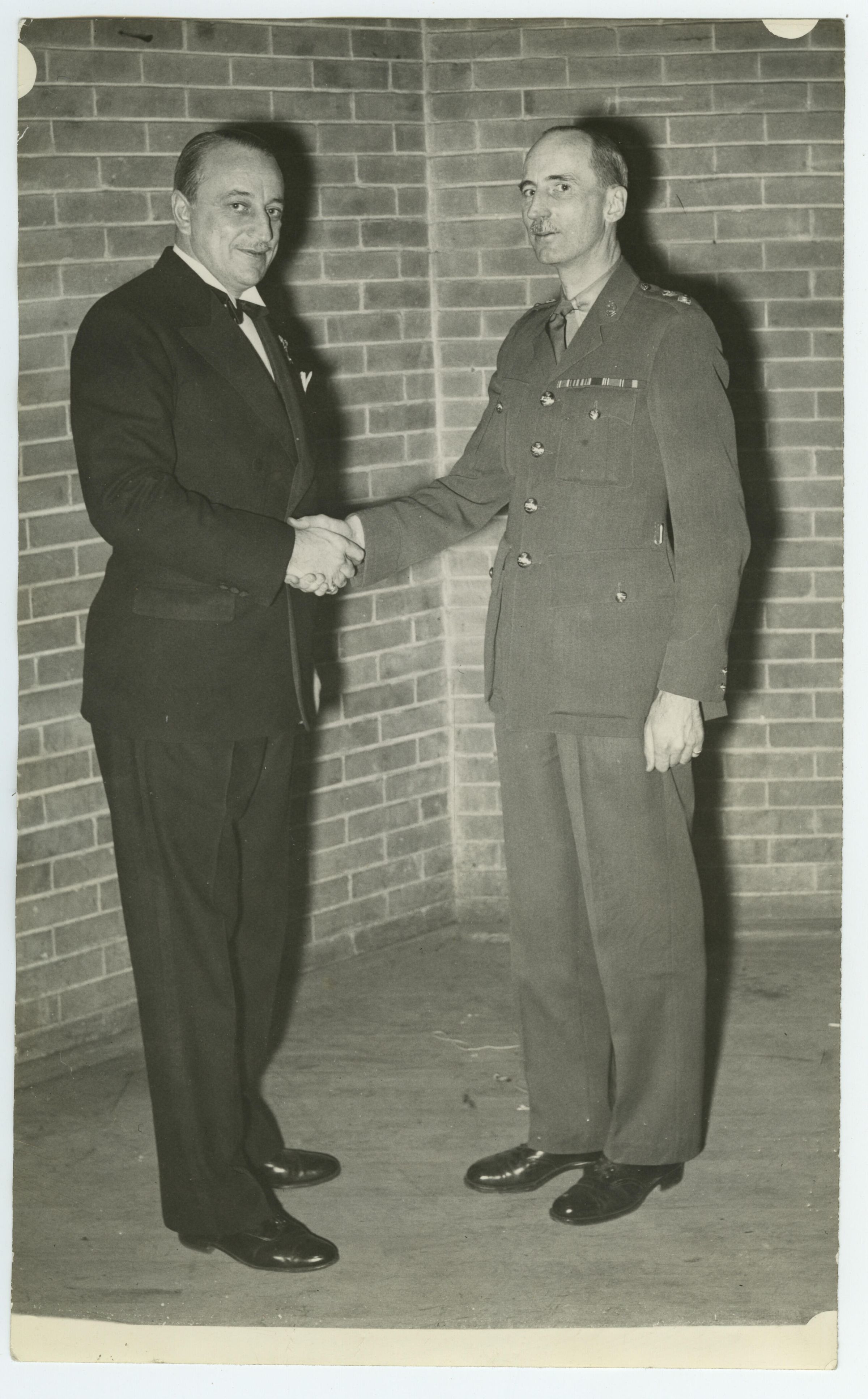 Lt-Col J. Eric Slessor greeting an un-identified returning veteran at the Royal Montreal Regiment's 25th Anniversary Dinner.Photograph Details