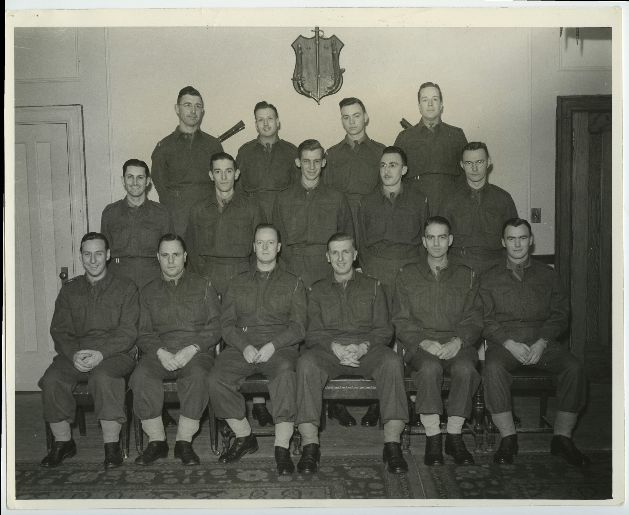 Fifteen officers of the 2nd Battalion, The Royal Montreal Regiment, are posing for a group portrait in the Officers' Mess of the Westmount Armoury. They were newly commissioned and destined for units of the First Canadian Army as reinforcements.Photograph Details