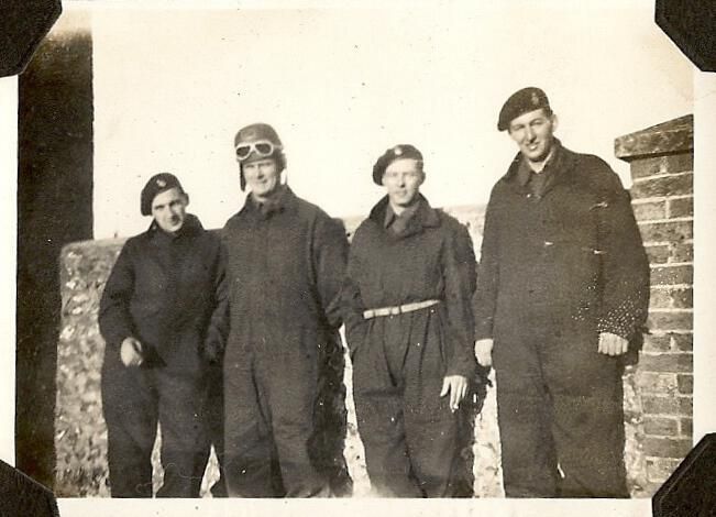A black and white photo of four members of the 32 Reconnaissance Regiment (RMR) Intelligence Section standing in front of a brick wall, wearing black coveralls.Photograph Details