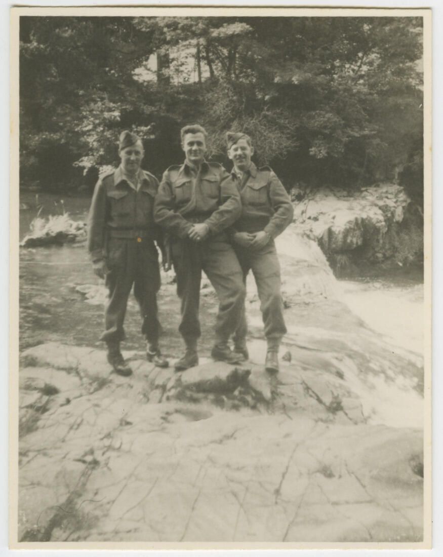 An informal photograph of three RMR Officers, Major D.H. Campbell, Captain P.P. Mustard and Major J. L. Blue taken at the edge of a waterfall in Abercrai, Powys, Wales, while the regiment was on training exercises in the area, August 1942.Photograph Details