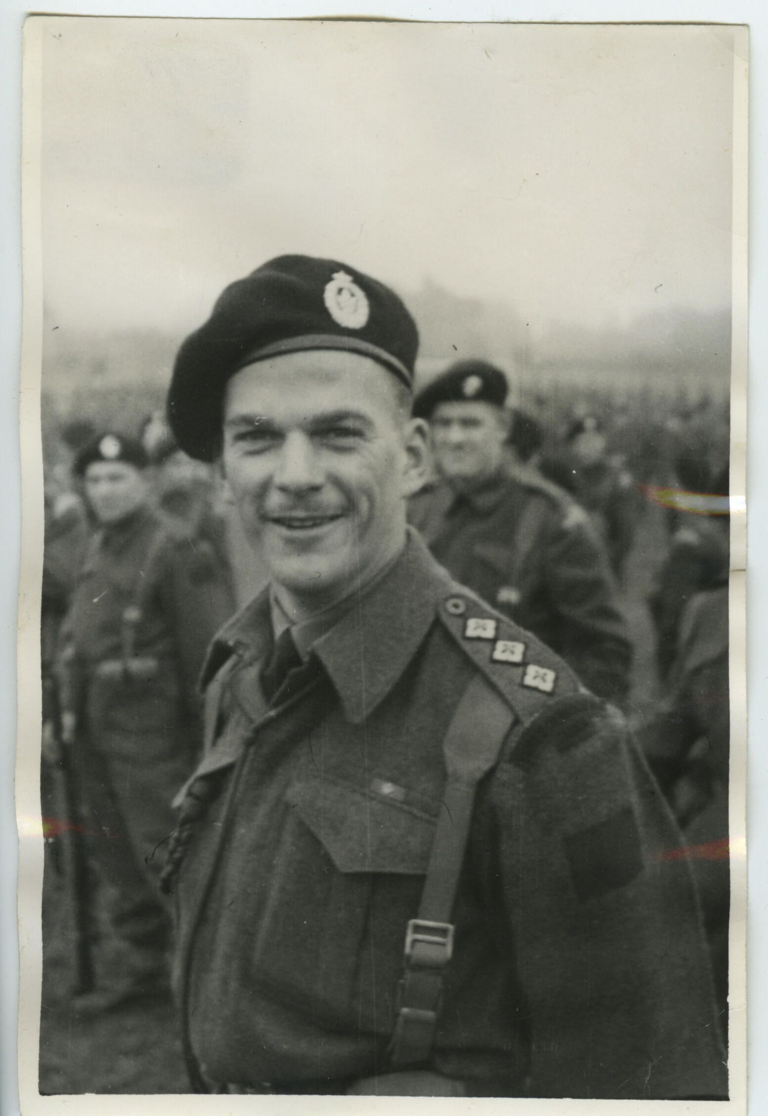 A black and white photo of an unidentified Captain in the BC Dragoons, wearing British/Canadian battledress and the black beret of the Royal Canadian Armoured Corps.