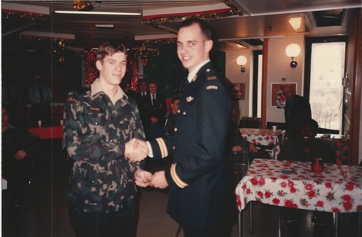 Colin Robinson, Officer Commanding Bravo Company, awarding the promotion to the rank of corporal during the Christmas dinner in the Junior Ranks' Mess.Photograph Details