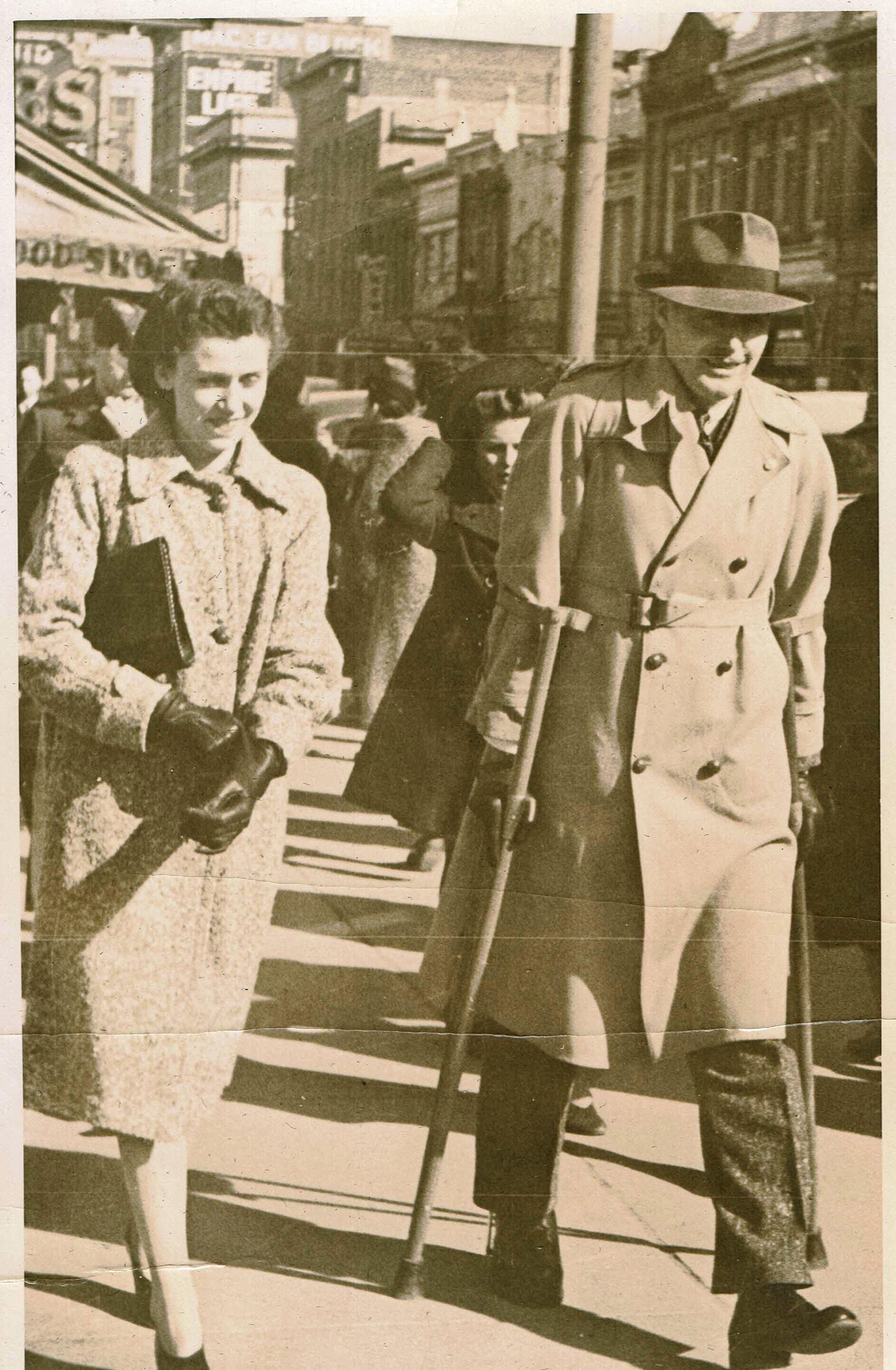 A black and white photo of Southmayde S. Scovil walking in civilian clothes on a Toronto street. Although he was discharged from the Christie Street Military Hospital, he is still walking with a leg brace and a pair of crutches.Photograph Details