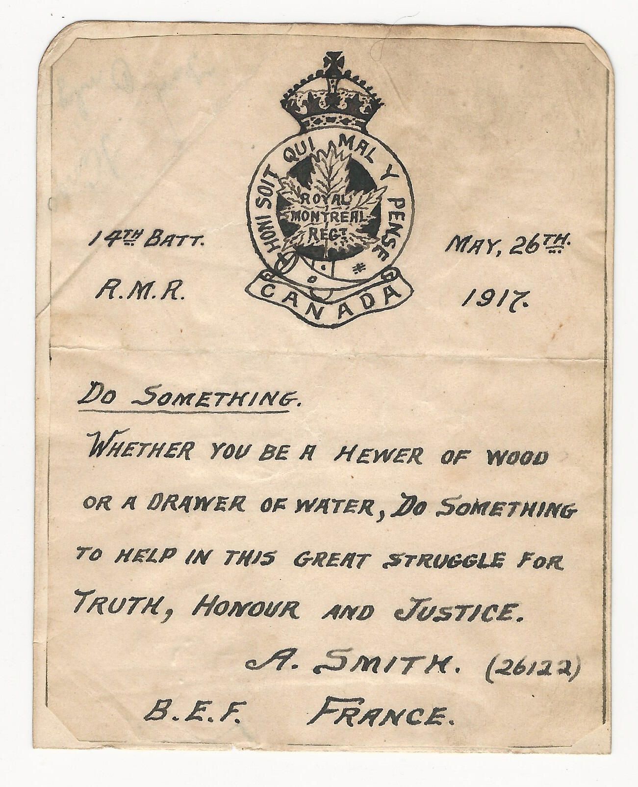 A plea for help in the War effort written by Private Albert Smith of the 14th Battalion. An Englishman, he enlisted at Valcartier in September 1914 and took his discharge in England in 1919. He was a signwriter by trade which probably explains the neatness of his writing and accuracy of his depiction of the Regimental crest.Lexicon