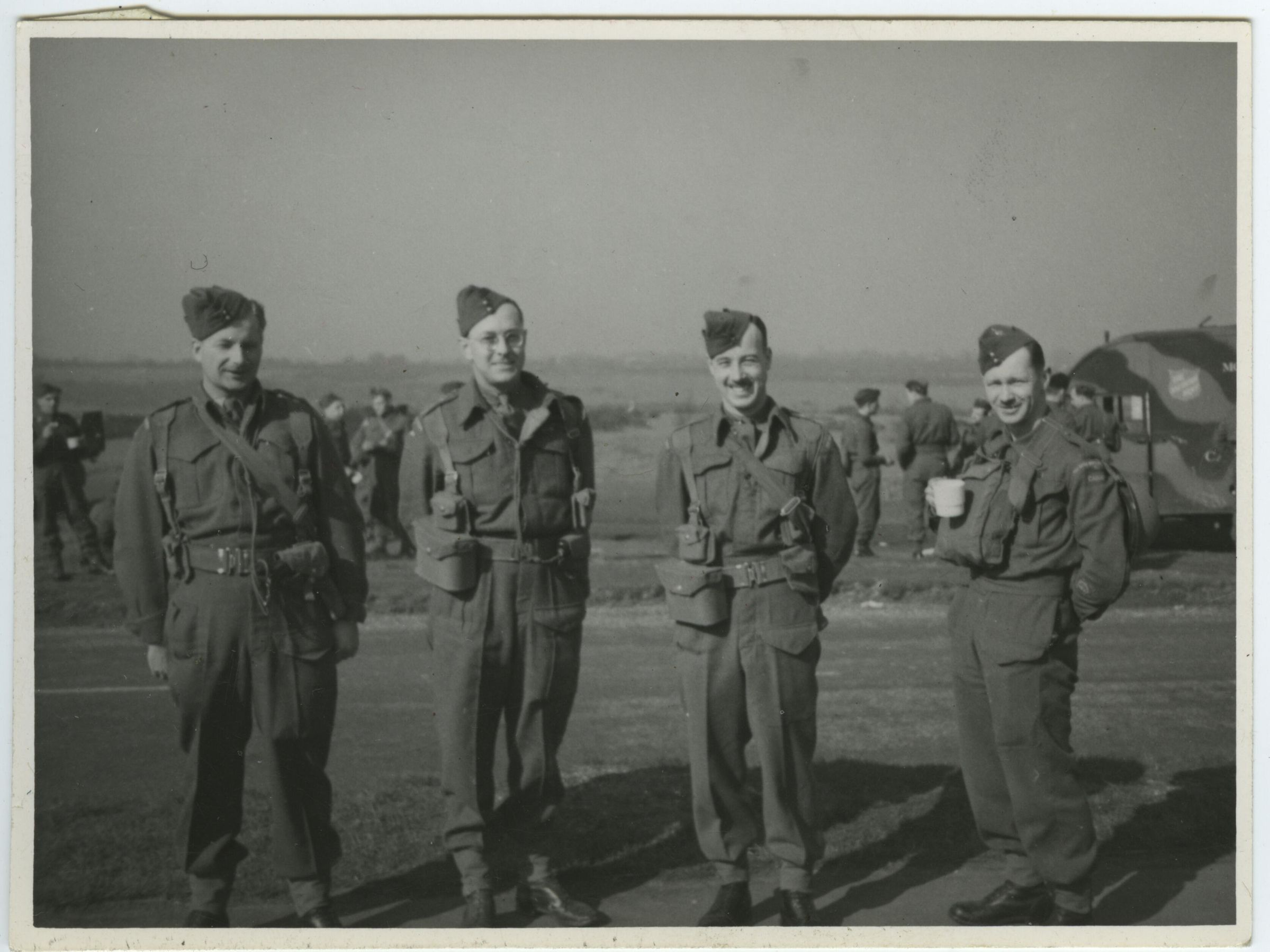 A black and white photo of four officers in Battledress uniform having a break and taking advantage of the presence of the Salvation Army mobile canteen.