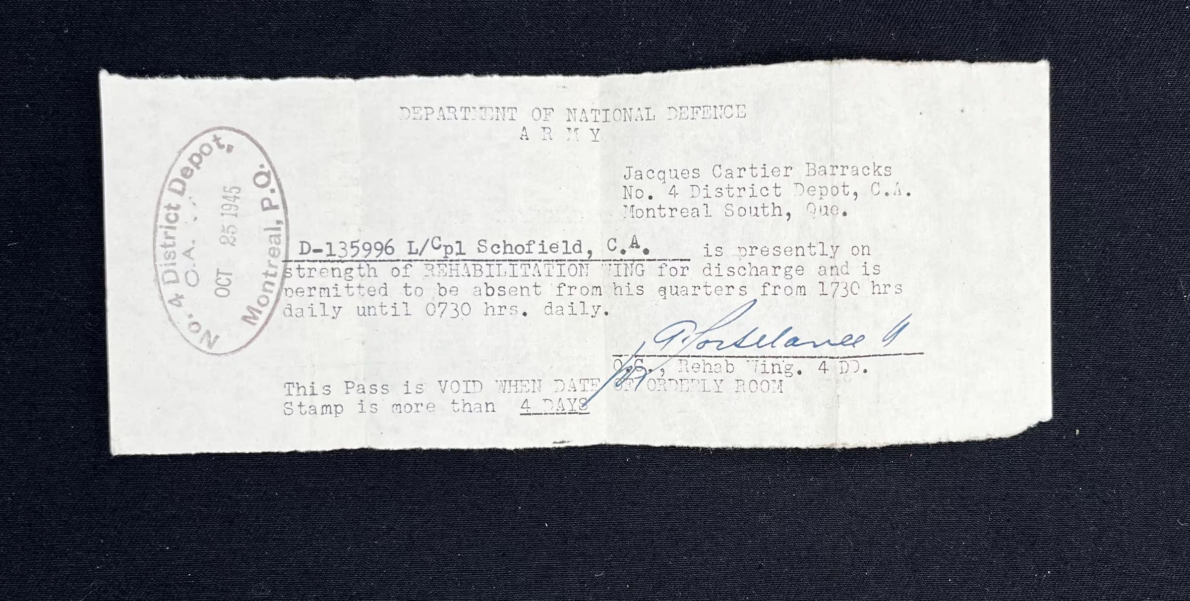 This pass comes from the Department of National Defence Army, and it states that L/Cpl Schofield is allowed to be absent from his quarters between 17:30 hrs and 07:30 hrs.Subject