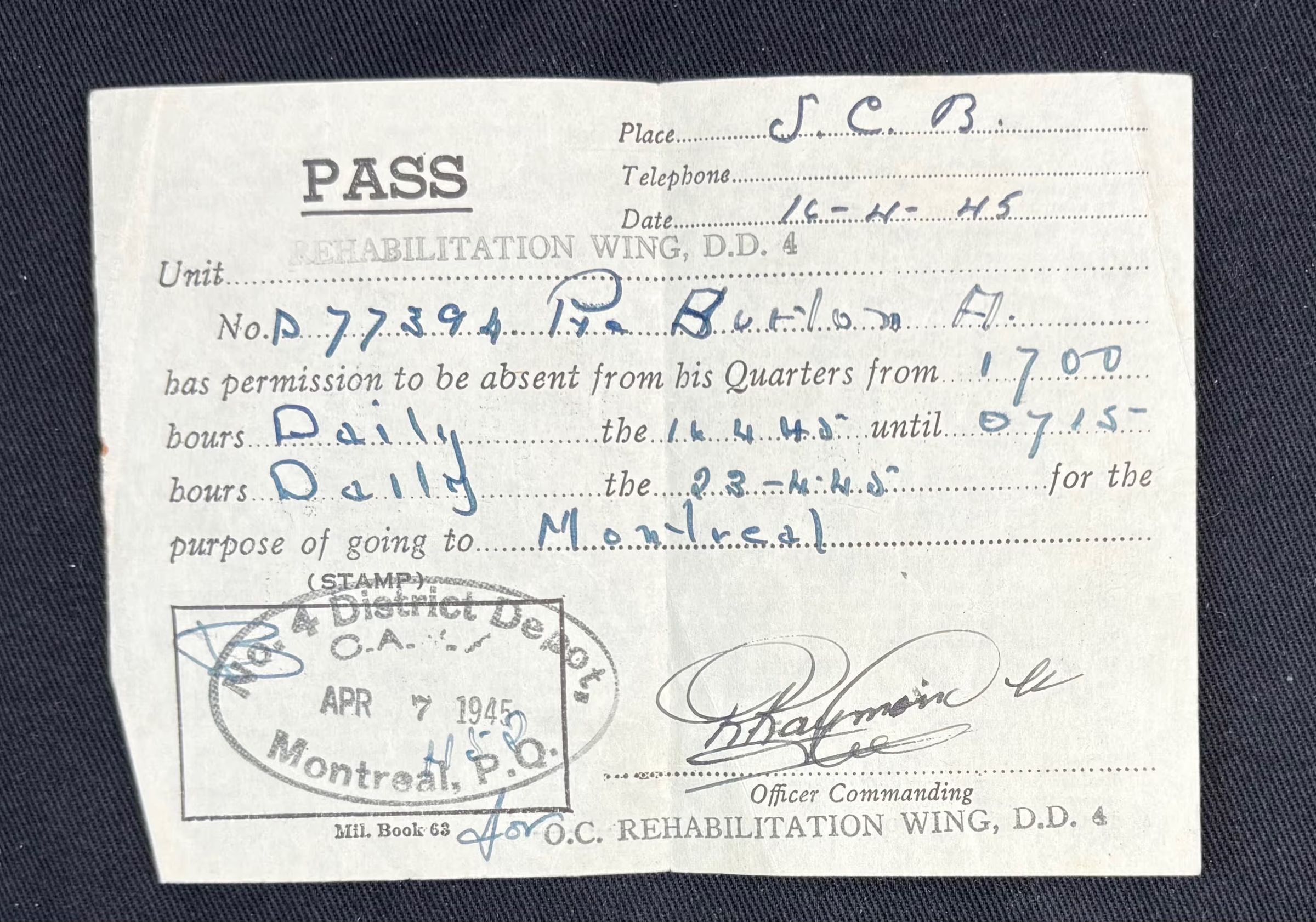 Paper absentee pass from the Rehabilitation Wing of No. 4 District Depot, where Private Alexander Burton stayed when he was discharged from the Canadian Military. The pass states that Pte. Burton has permission to be absent from his quarters from 17:00 until 07:15 daily, between April 16, 1945 and April 23, 1945, for the purpose of going to Montreal. The pass dated April 16, 1945 and is signed by the C.O. (signature present but difficult to read). There is a stamp on the left bottom corner reading "No.4 District Depot/ C.A.? / APR 7 1945 / Montreal, P.Q." , dating it to over a week earlier.