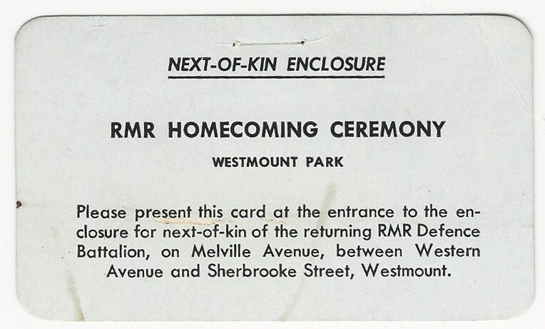 A pass for admission to the Next-of-Kin enclosure for The Royal Montreal Regiment Homecoming Ceremony held at Westmount Park on Saturday, September 22, 1945.Archive Details