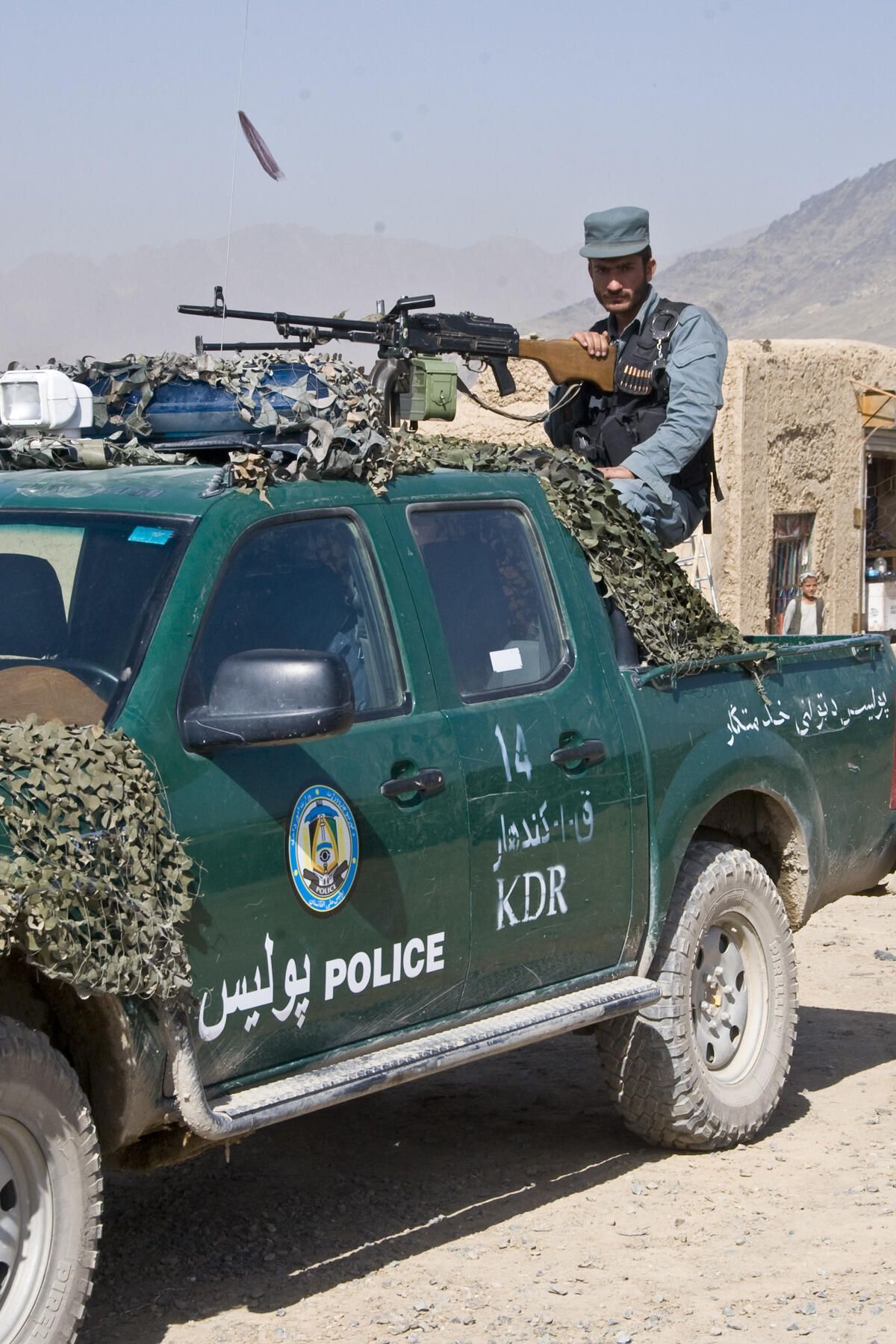 An Afghan National Police (ANP) escort vehicle equipped with police strobes and an FN MAG general-purpose machine gun. A member of the Police is tending the weapon.