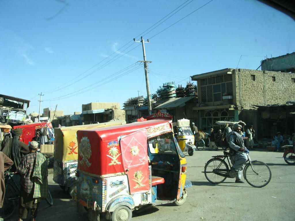 A scene from the Kandahar City streets where motorized Tuk-Tuk, or auto-rickshaws, are parked on the side of the road. As a vehicle to hire, just like a taxi, this is a popular means of urban transportation. Their owners would often decorate them with very colourful art to attract the customer's eyes.Photograph Details