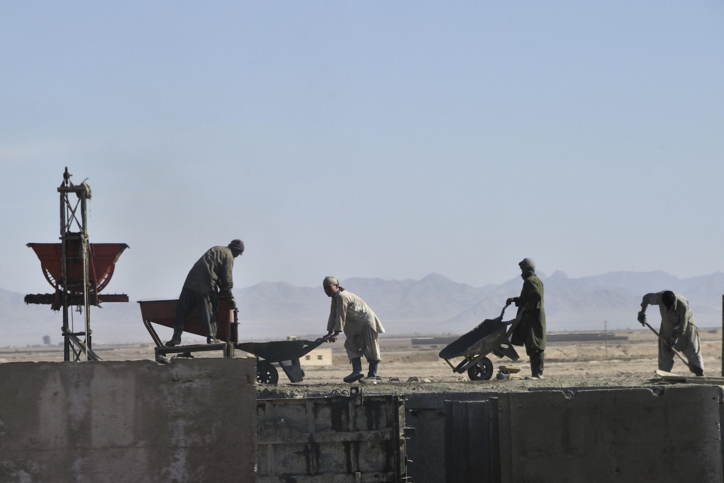 A number of Afghan men working on an infrastructure project, financed and supported by Canadian Foreign Aid. With every project, local Afghans were consulted and Afghan contract workers were employed, thus creating jobs and contributing to the economy.