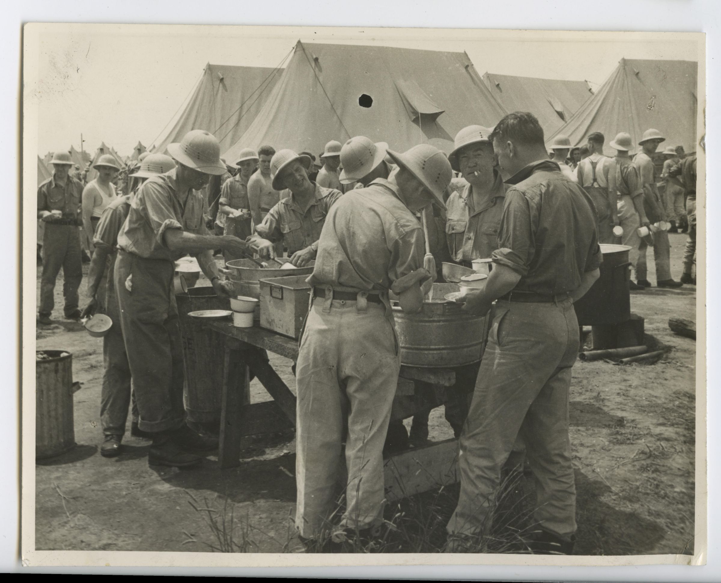 In the background other soldiers wait their turn holding cup, plate and bowl. On the table in the foreground are three washtubs; one with soapy water, one with a disinfectant and one with clean water. There are two trash cans; one for trash and one for food scraps.Photograph Details
