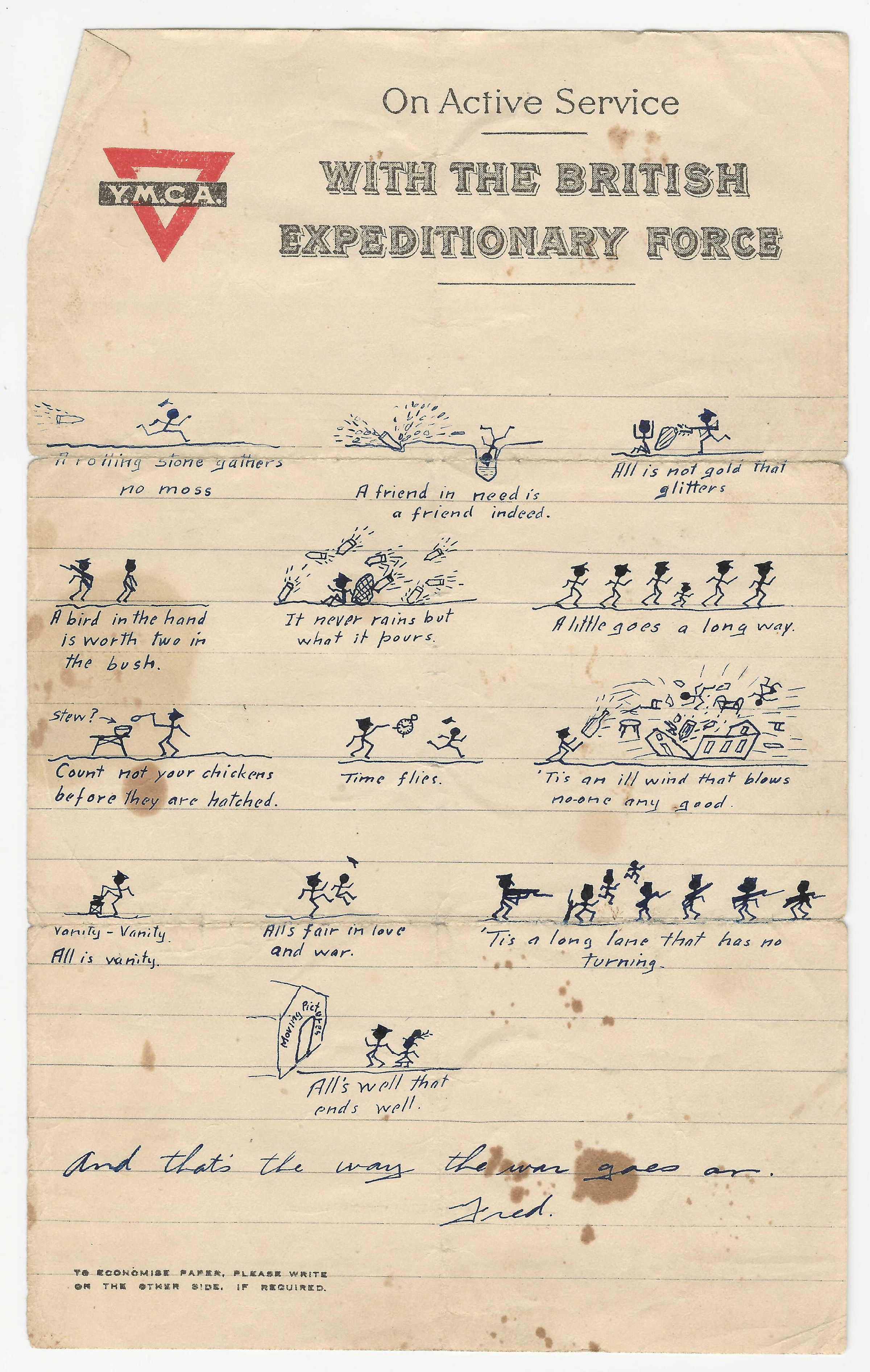 Humorous doodle made by Fred Bowman. Thirteen small stick figure drawings were drawn on a Y.M.C.A lined sheet. Underneath each is a short sentence to give context.Artwork Details