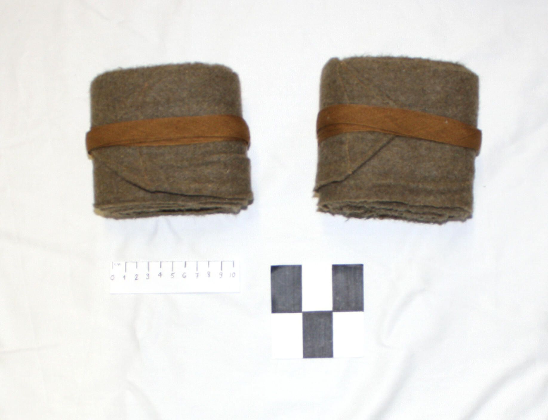 A pair of woollen puttees with attached tapes. The puttee is a long narrow piece of cloth wound tightly and spirally around the ankle or lower leg and serving to provide both support and protection. In WWI puttees were wound around the leg from the ankles up to the knee. In WWII, the puttee overlapped the top of the boots and was wound around the ankle to finish overlapping the bottom cuff of the trousers. In either case, the puttee was held in place by the attached tape which was then wrapped around and secured by being tucked inside itself neatly. In addition to providing ankle support its purpose was to prevent dirt and insects from entering the top of the boots and inside the trouser legs.Made/Created
