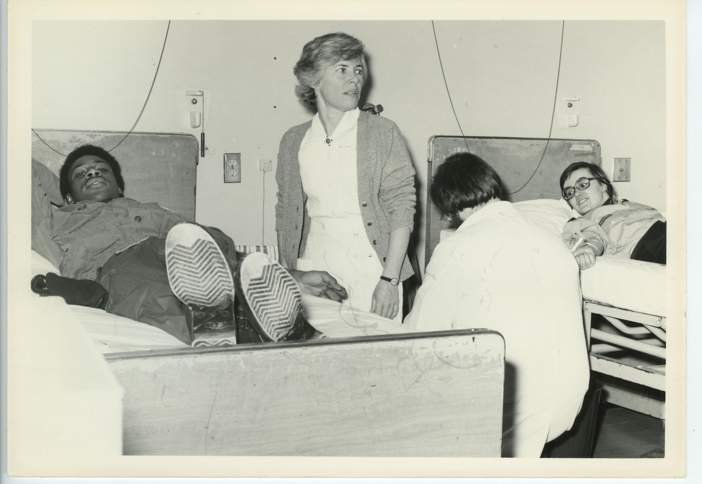 Two Royal Montreal Regiment members, Barbara Tarcynski on the right and Adrian Grant on the left lying in bed participating in the Annual Blood Drive taking place at the Royal Victoria Hospital.Photograph Details