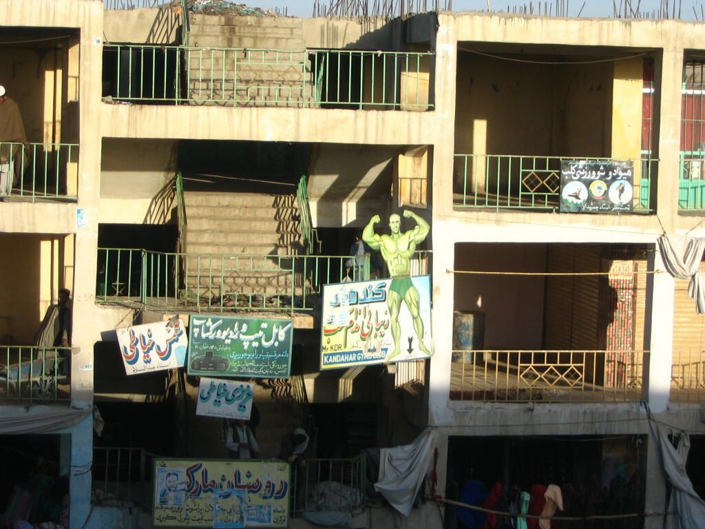 A scene from the streets in Kandahar City showing an apartment complex. Merchants advertise or show merchandise from the balconies and railings. The green man in the centre is the publicity for a gym.