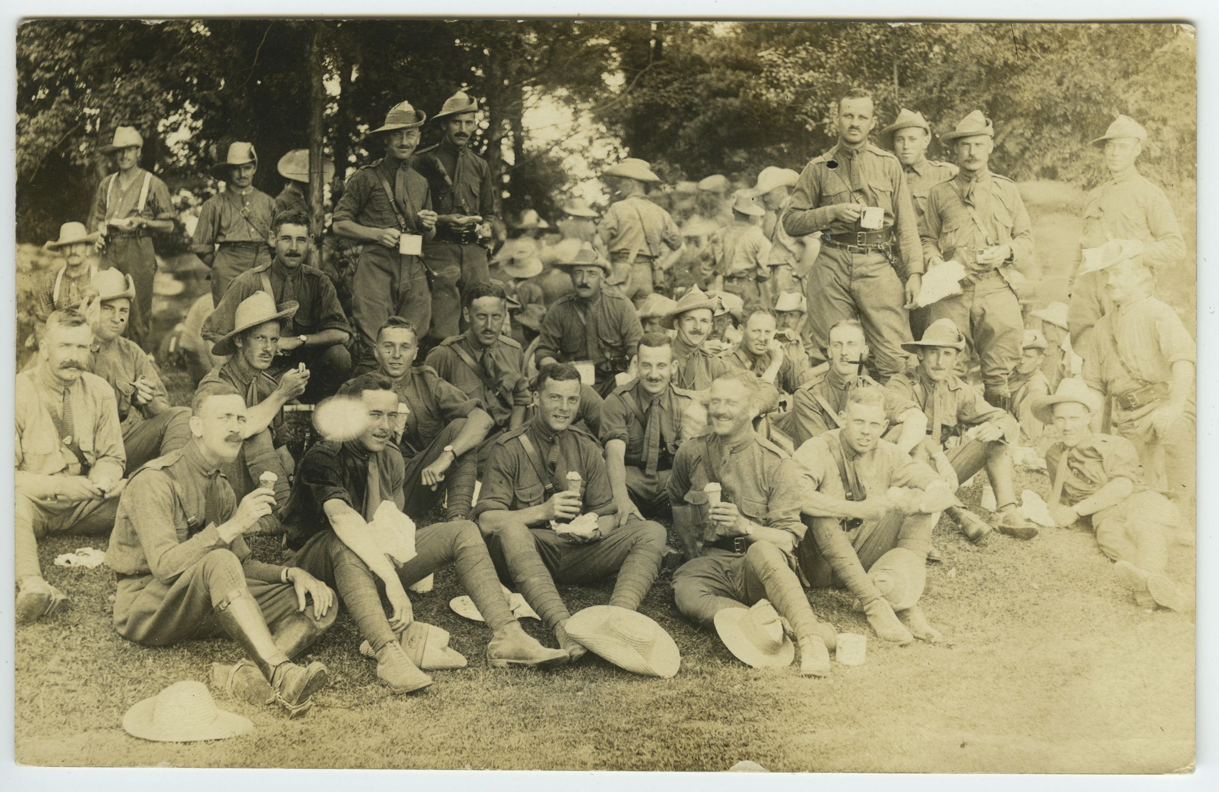 A group of Australian soldiers gathered on the grass. Many are eating ice cream cones. Some are wearing their distinctive Australian "Slouch" hats while others have taken them off.Made/Created