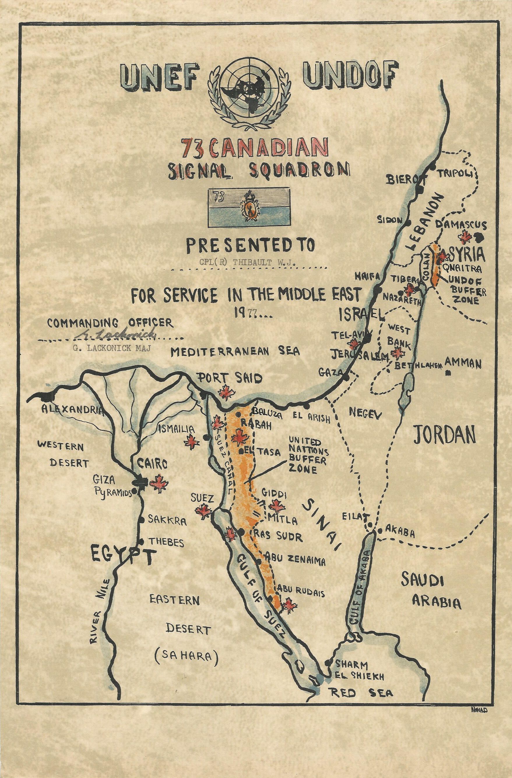 A certificate presented to Corporal William J. Thibault by the 73 Canadian Signal Squadron for his service in the Middle East in 1977. This includes a drawing of the map of the area surrounding the Suez Canal and the area of Syria. Corporal Thibault served in both areas with the United Nations-led mission of UNEF and UNDOF.Relationships