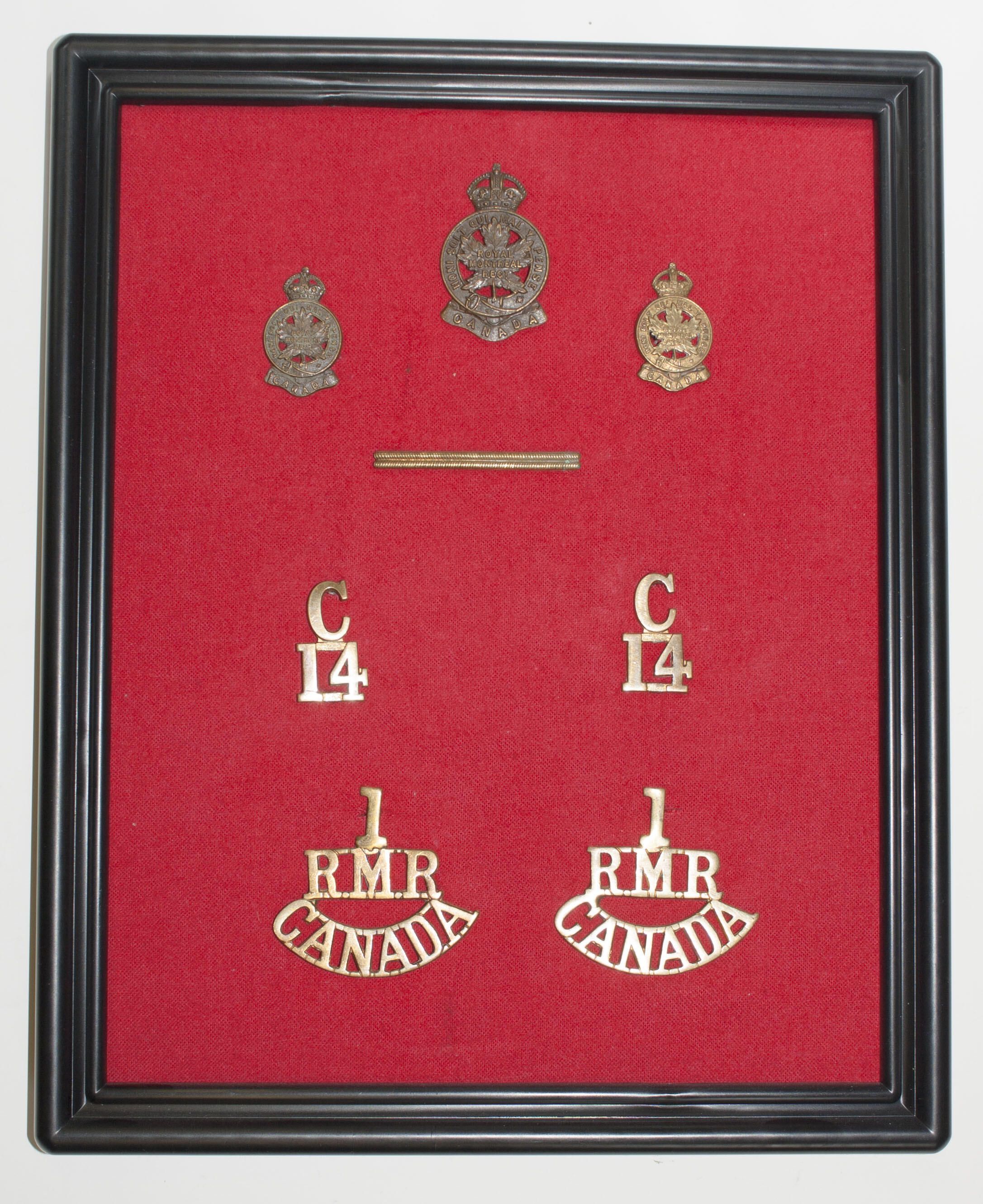 Royal Montreal Regiment cap badge, Royal Montreal Regiment collar dogs, brass wound stripe, brass C/14 14th battalion collar dogs and brass 1st Battalion, Royal Montreal Regiment shoulder titles mounted on a red felt background.Lexicon
