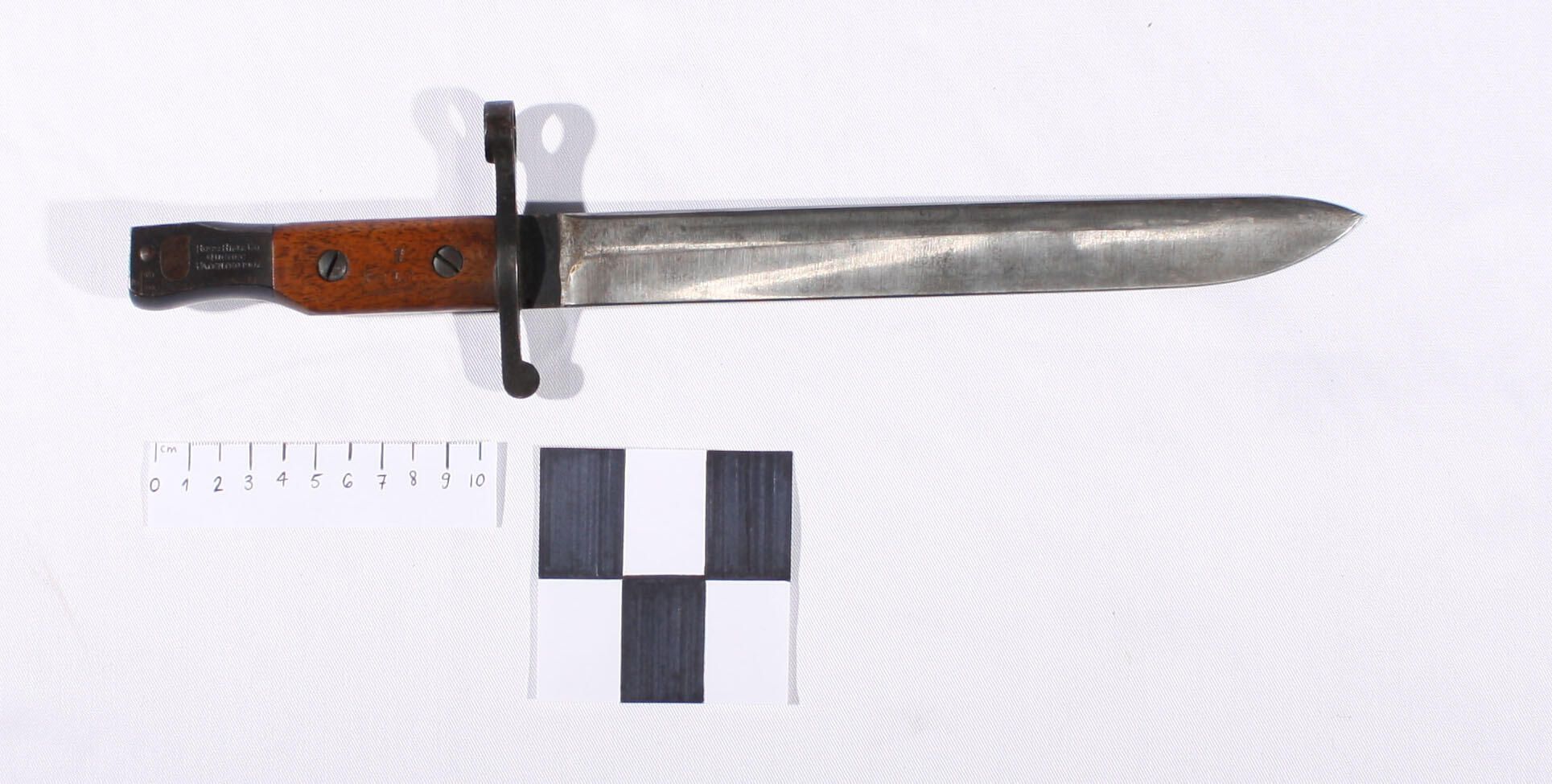 Ross Rifle bayonet with a wooden handle and sharpened blade, and light brown leather scabbard. It was made by the Ross Rifle Co., Quebec City, and patented in 1907.Lexicon