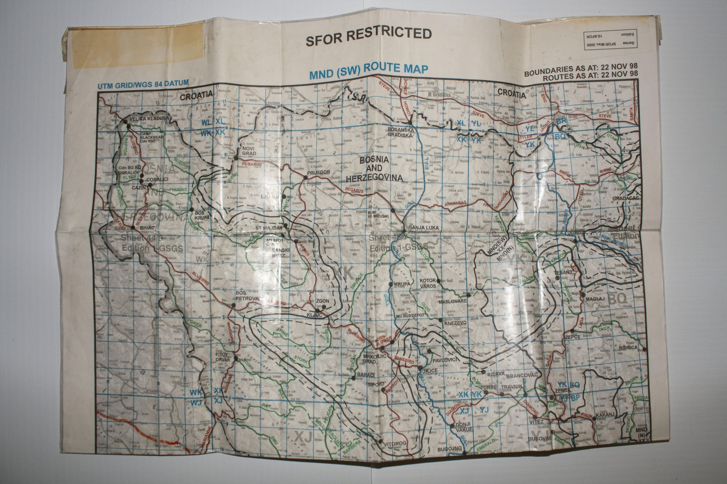 Route map of the border area between Croatia & Bosnia and Herzegovina. The map was distributed during the operations of the Stabilisation Force led by the United Nations in Bosnia and Herzegovina (SFOR).