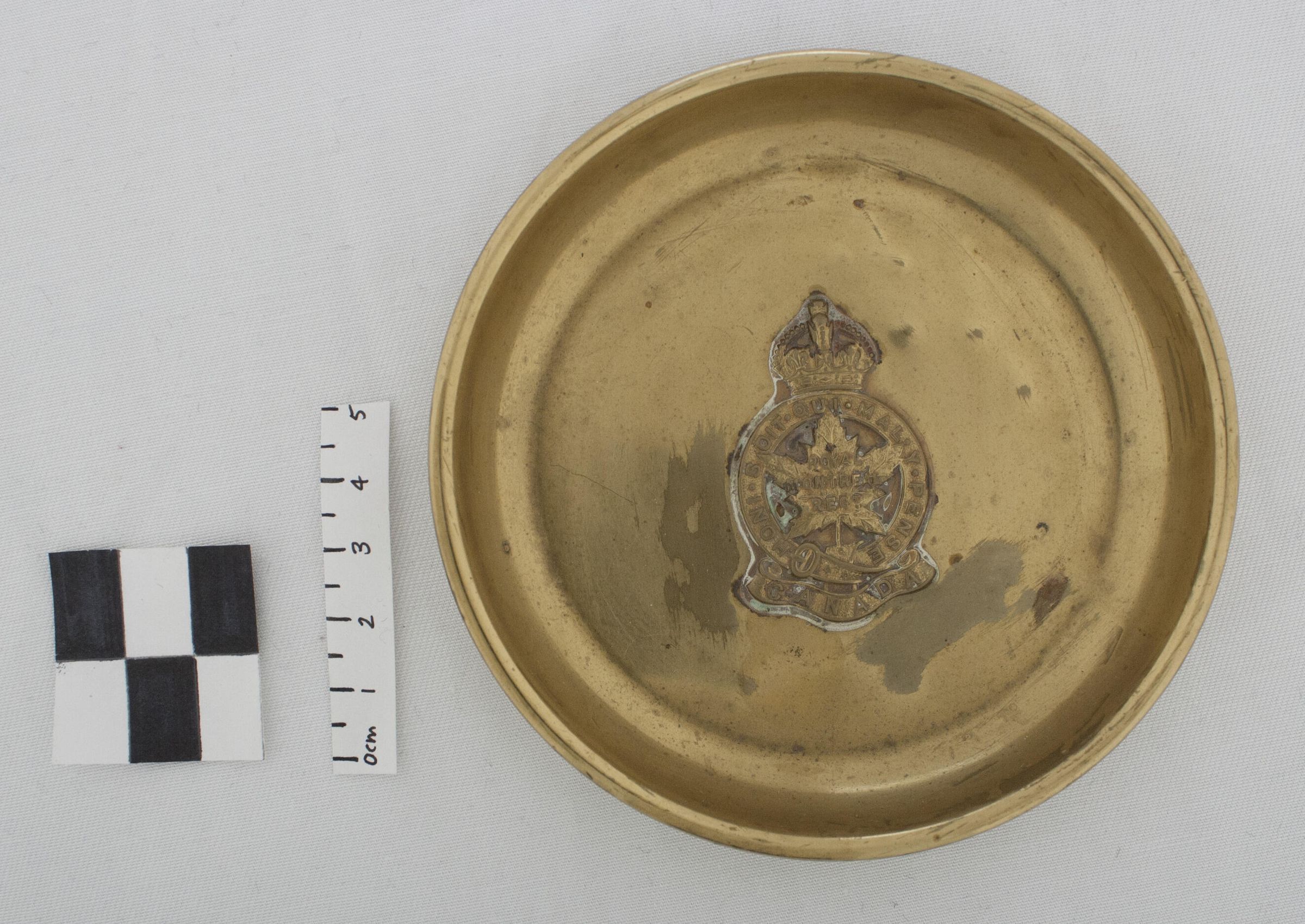 Circular brass drink coaster with The Royal Montreal Regiment crest embossed in the centre. On the verso, it is inscribed: " W. Scully Montreal ", the producer and retailer.Made/Created