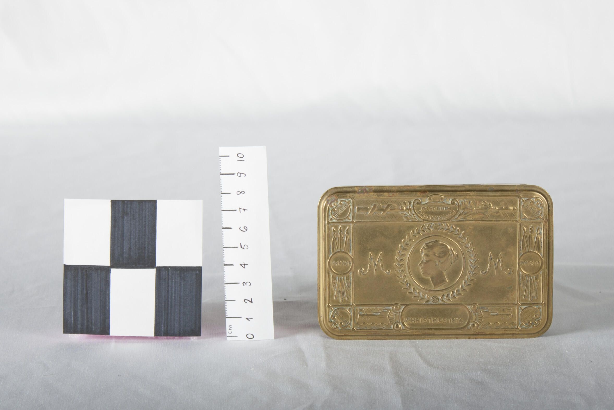 Princess Mary, aged 17 yrs. at the time, organized the raising of public funds to provide these small gift boxes to every soldier and sailor in the armed forces of the British Empire. Officers boxes were made of silver and of brass for all others.