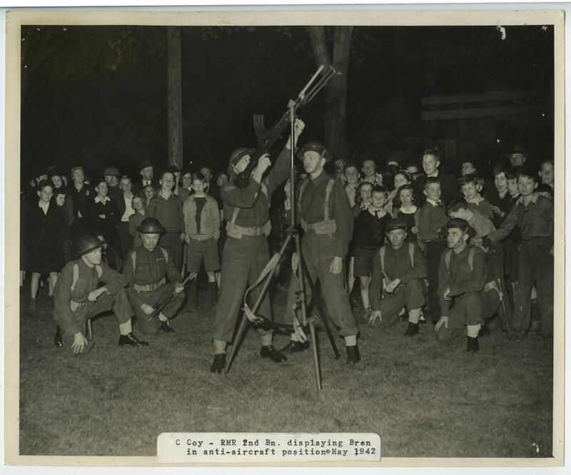 A black and white photo of members of the 2nd Battalion, The Royal Montreal Regiment, going through anti-aircraft drills in front of an audience. The kneeling soldier second from the left is holding a replacement barrel for the Bren gun. In a sustained fire the barrel would get extremely hot and it would be necessary to change barrels.Photograph Details