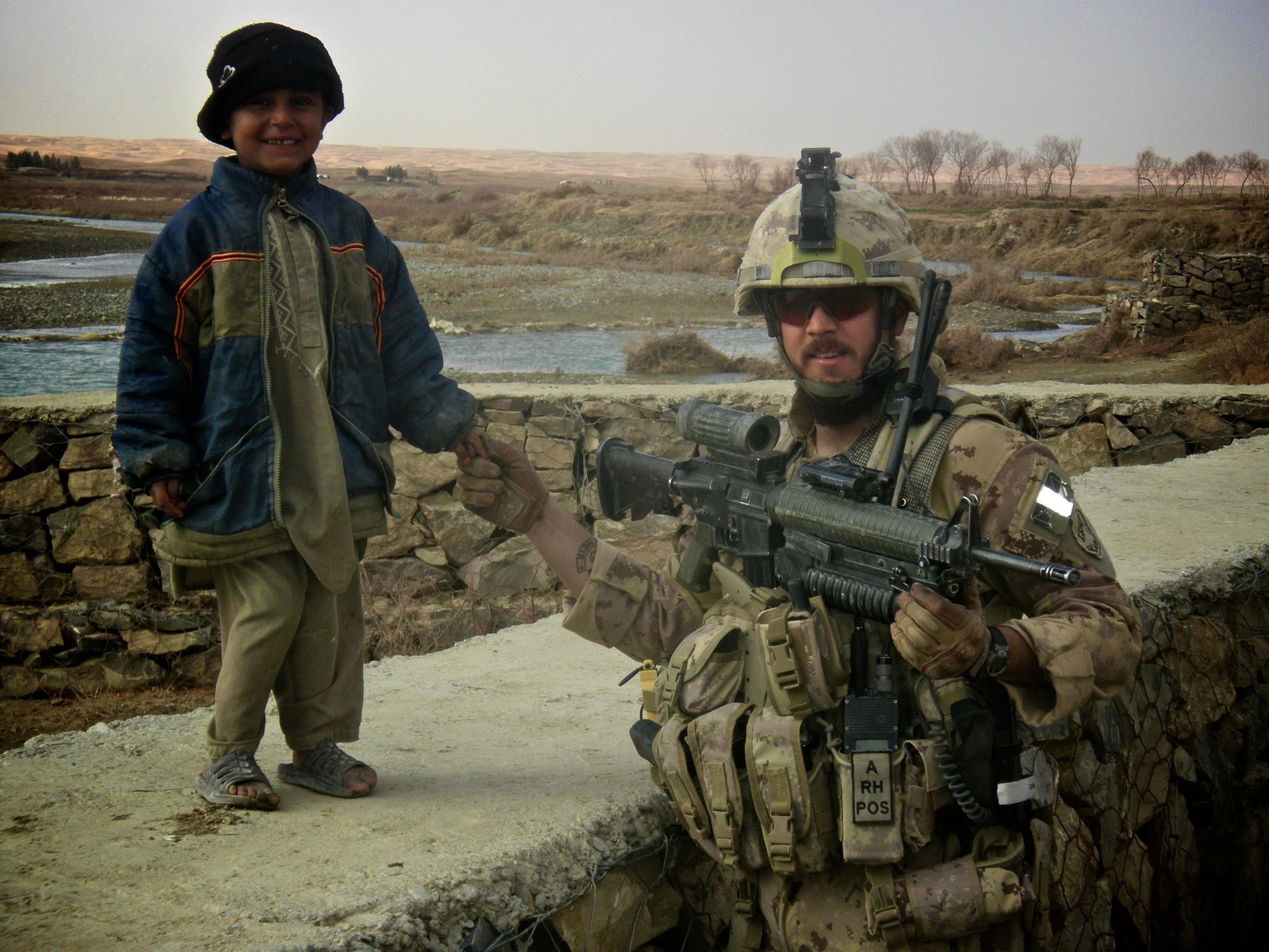 Brent McNair taking a moment to connect with a local child while on patrol in Afghanistan.