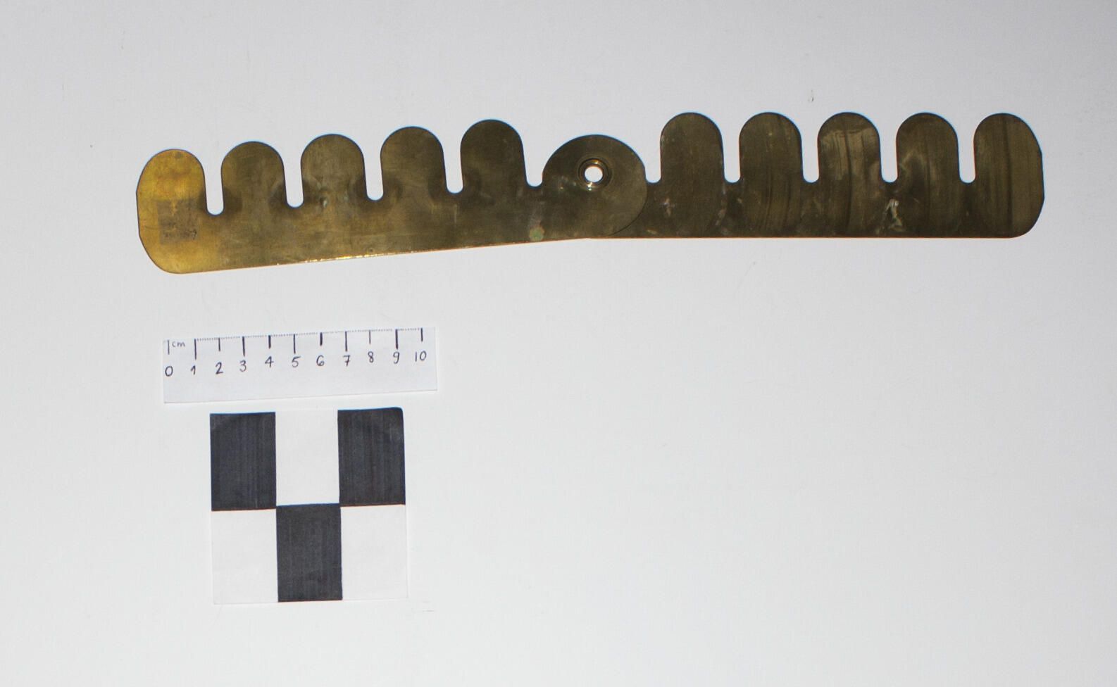 A hinged brass button cleaning stick used when polishing buttons. They were made in different shapes but this one was made to polish five buttons at one time. In this case the five buttons were slotted into the five notches on one side of the cleaning stick and then the other side of the stick was swung around to enclose the buttons while they were being polished with cleaner. The purpose was to keep the cleaner off the uniform fabric during the polishing process.Made/Created