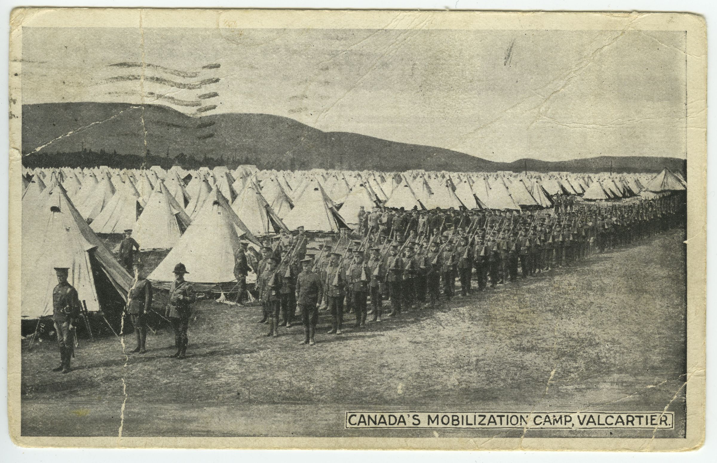 A postcard picturing First War soldiers at Camp Valcartier standing in "column of route" with their rifles "shouldered" about to march off. Beyond them are a great many white Bell tents in which they lived. In the distant background are the foothills of the Laurentian Mountains. The message on the reverse was written by someone named Frank to Ada at an address in Montreal.Made/Created