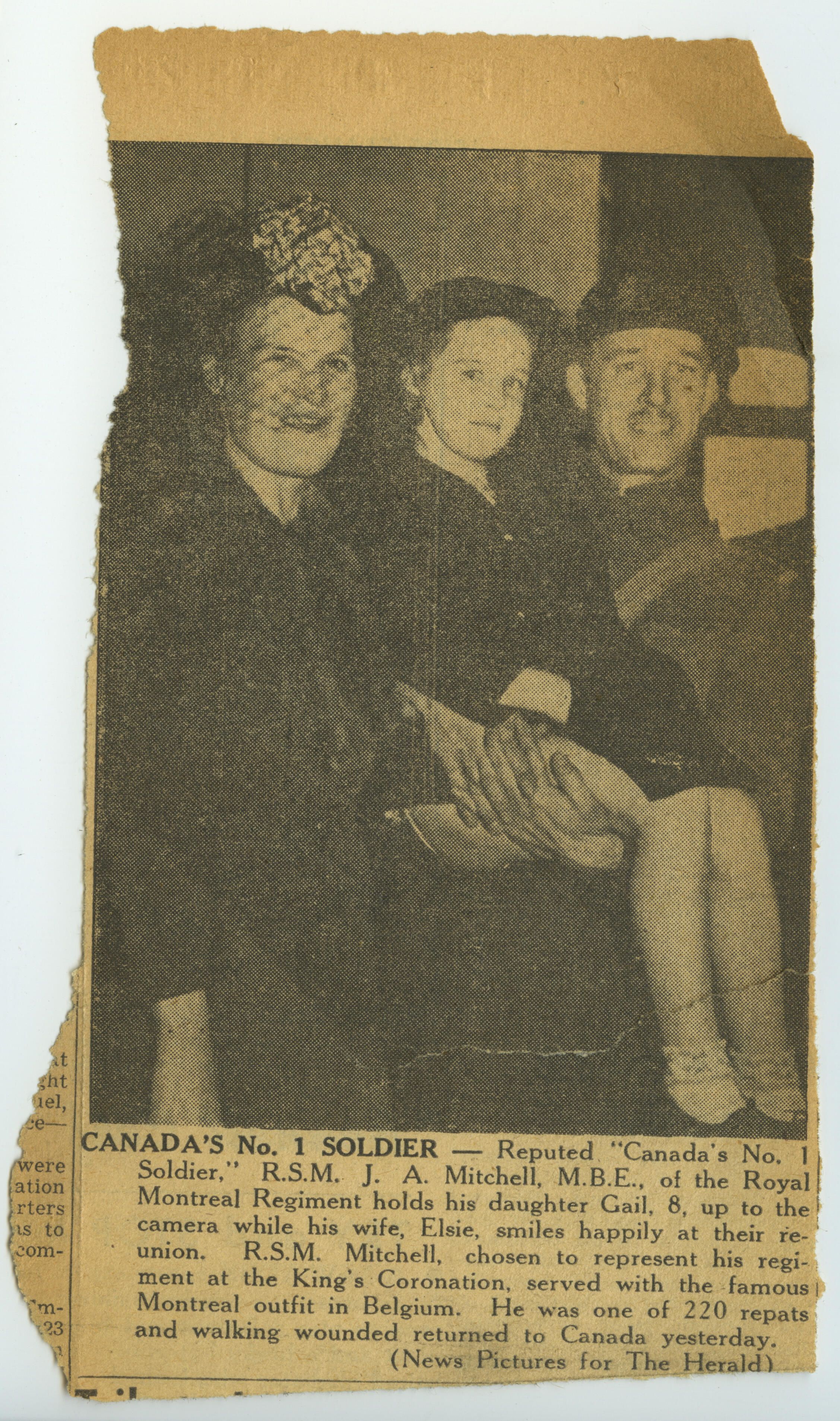 A newspaper clipping with photograph of RSM James A. Mitchell of The Royal Montreal Regiment being greeted by his wife and young daughter upon his return to Montreal. He is holding his daughter in his arms.Lexicon